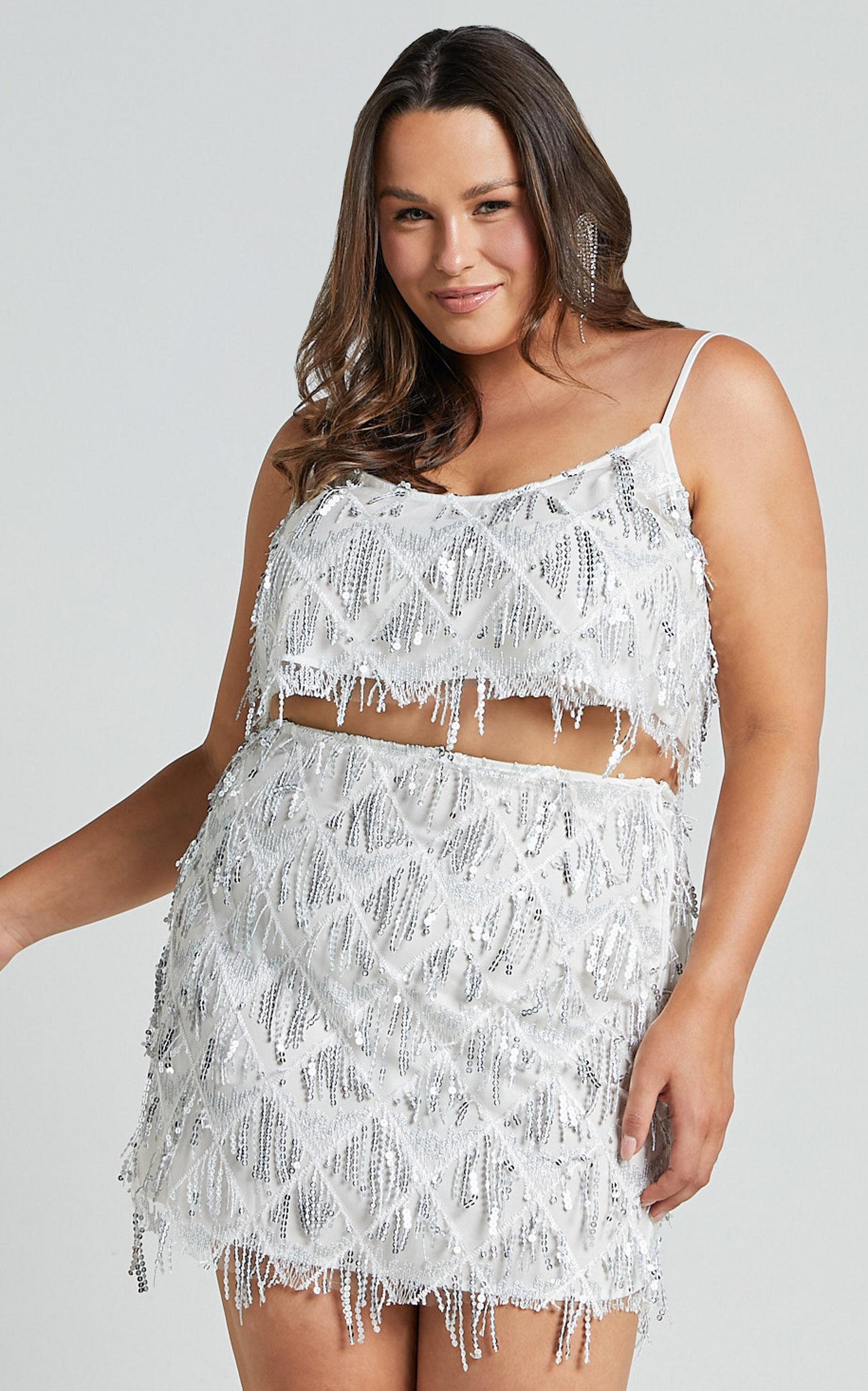 Shine brighter than a disco ball with our Khrizza Mini Skirt! This stunning pencil skirt is made from a mesmerizing sequin diamond mesh fabric in shades of white and silver. Perfect for party nights and festival fun, this flirty mini skirt will make you the center of attention wherever you go. Crafted from high-quality polyester, it hugs your curves in all the right places, giving you an irresistible silhouette that's bound to turn heads. So slip into this sparkling beauty and get ready to dance the night away!Product Details:Mini sequin pencil skirtHigh waist designPerfect for parties and festivalsMade of polyesterIdeal for winter eventsSize and FitSize S / 8 length: 42.5cm / 16.73inMaterial and CareLining: 10% Elastane Main Fabric: 100% Polyester Lining: 90% PolyesterLow / No stretch