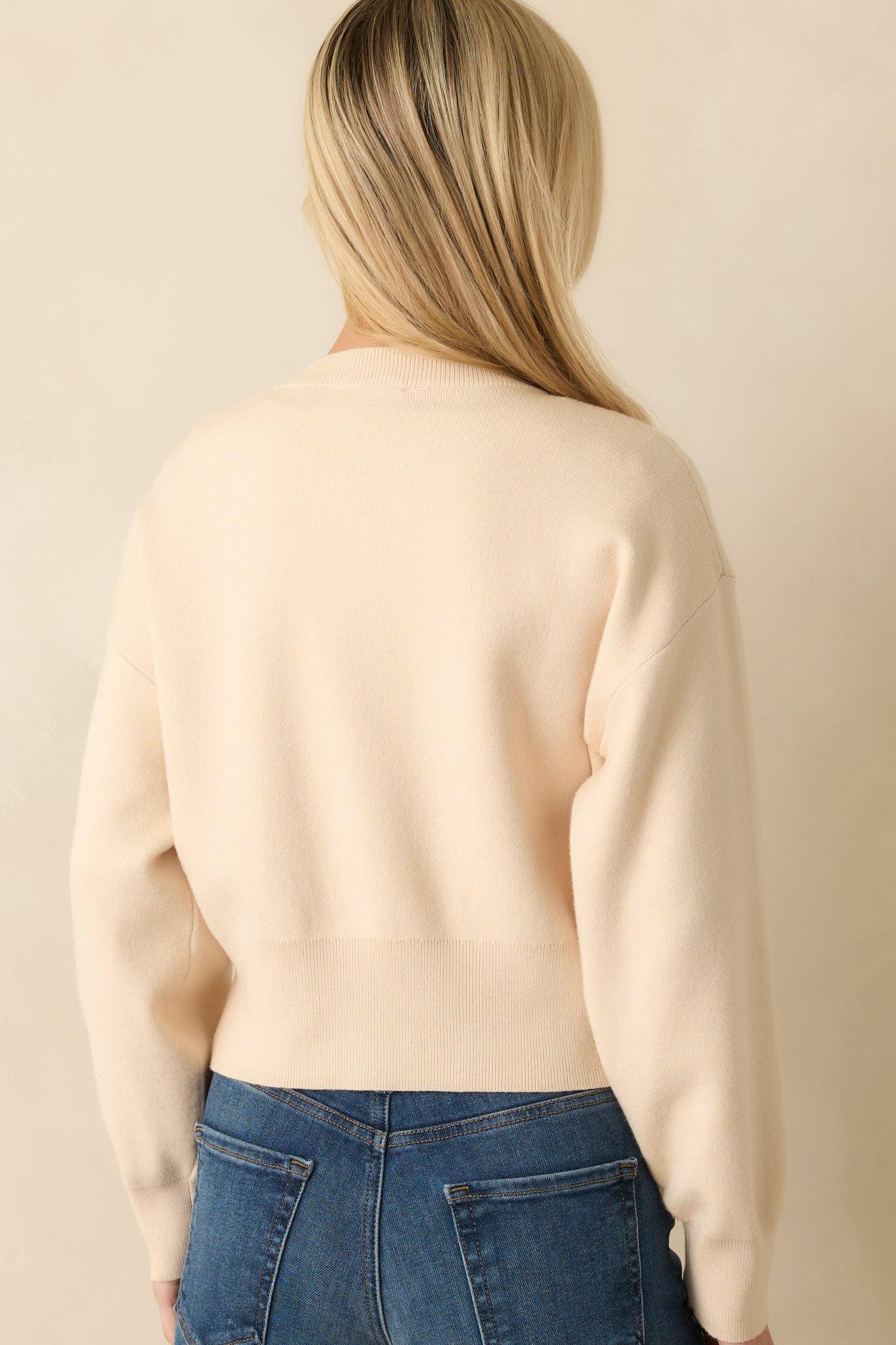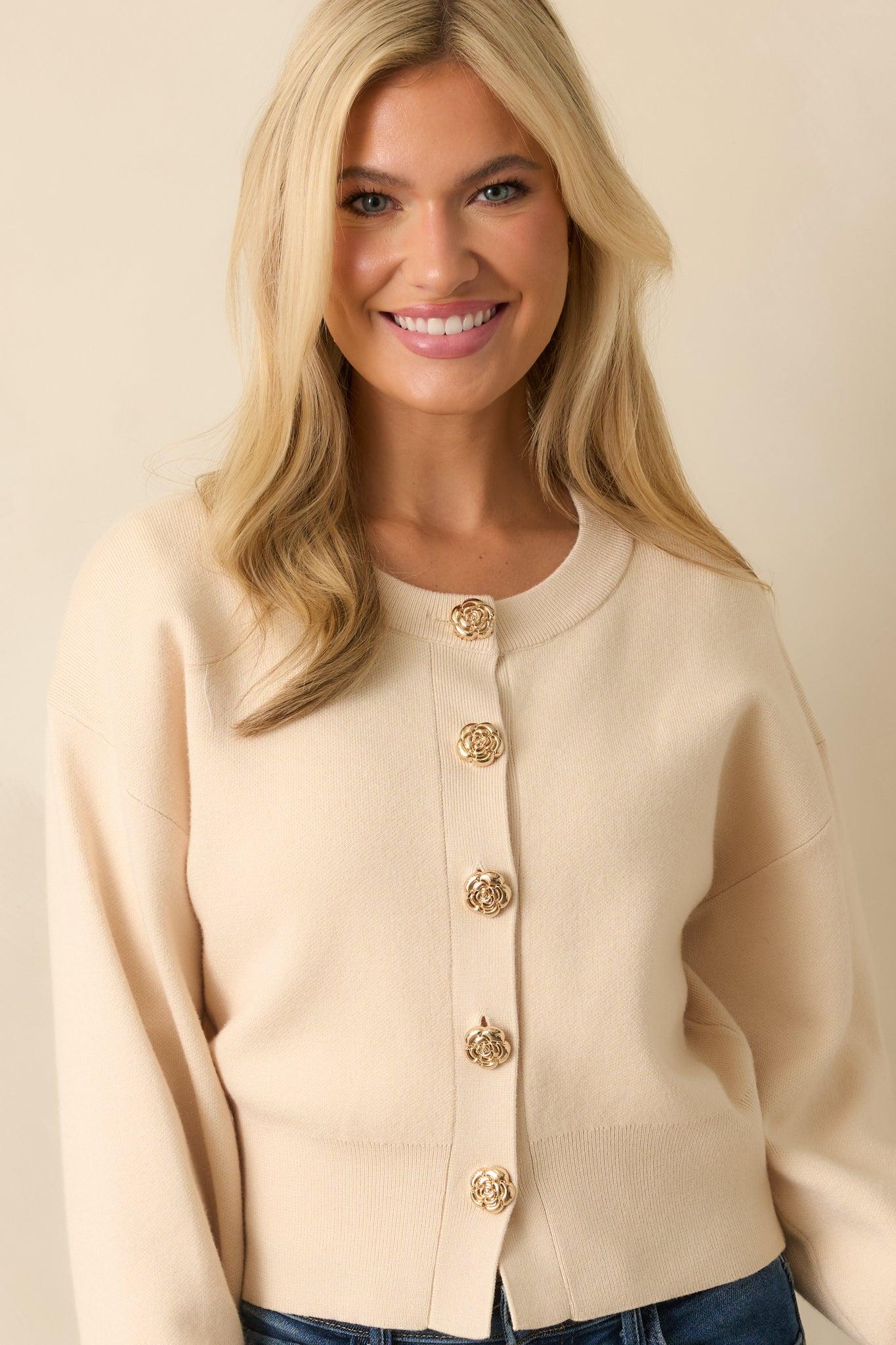The Kind Of Comforting Ecru Beige Button Front Long Sleeve Cardigan is your soft spot on busy days and quiet nights alike. It’s the piece you’ll keep nearby because it just makes everything feel a little better. This ecru beige cardigan features a functional gold flower-shaped button front, long sleeves, a tapered fitted waistband, a crew neckline, and ribbed hems.