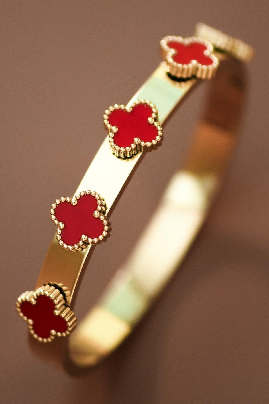 18K gold plated stainless steel hinged bangle bracelet. Inner oval diameter: 2.36" The bracelet is hypoallergenic, waterproof, fade-resistant, and tarnish-free, ensuring its beauty lasts for years. Perfect for everyday wear or special occasions. Clover Hinged Bangle Bracelet | Stainless Steel Bracelet | Real Gold Dipped Bracelet | Real Gold Plated Bracelet | Waterproof & Sweatproof Bracelet | Simple Gold Bracelet