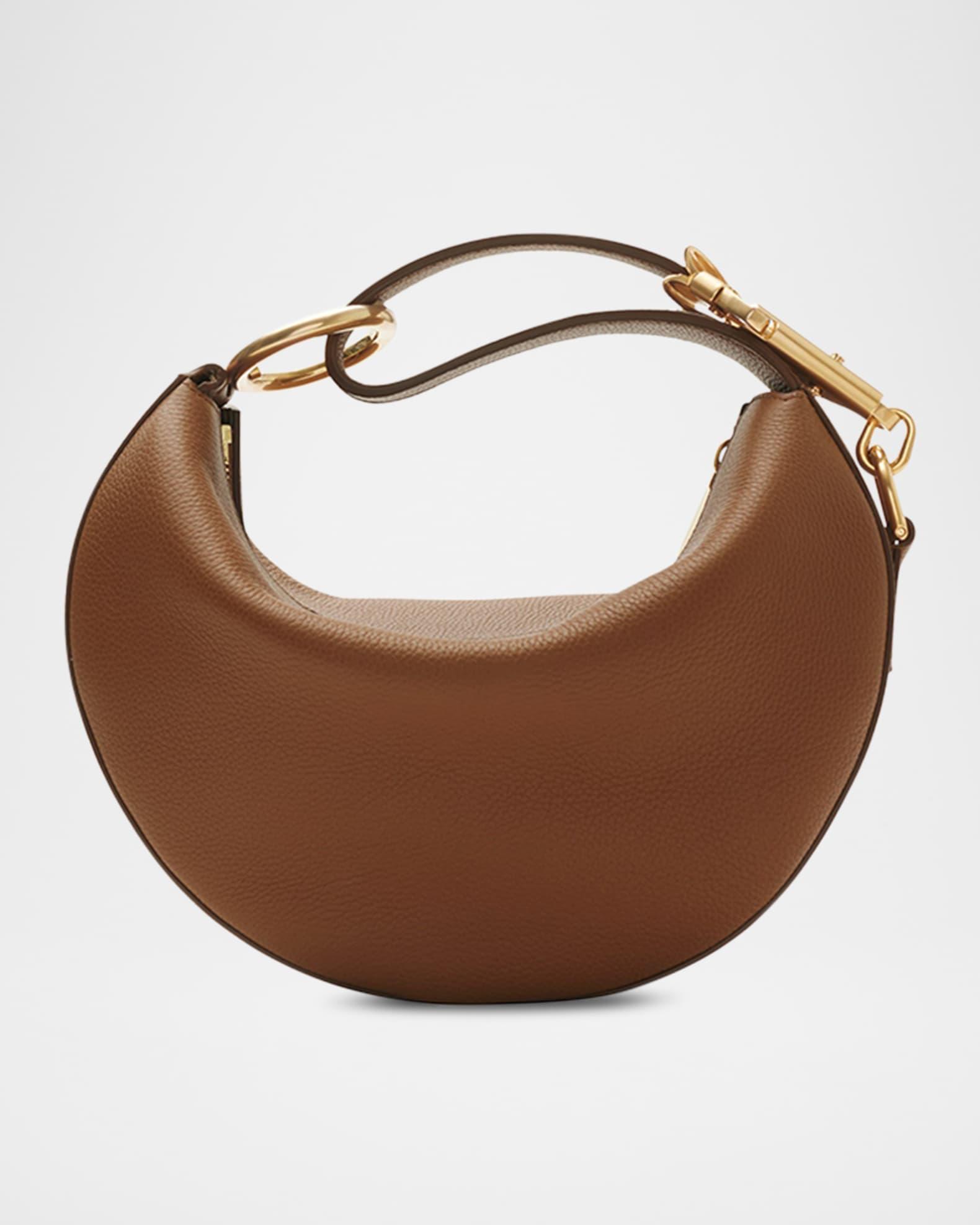 The Knight has been reworked as a mini shoulder bag crafted in Italy from grainy calf leather. This softly structured style is lined with supple suede and showcases the signature horse clip hardware B a play on their equestrian knight design. The hardware can be reattached to adjust the strap length. Burberry "Knight Arc" structured hobo bag crafted of grainy calf leather Adjustable shoulder strap with clip hardware Zip top closure Hand-painted edges Brushed metal hardware Suede lining Approx. 8.7"H x 11.2"W x 5.9"D Comes with a dust bag Made in Italy