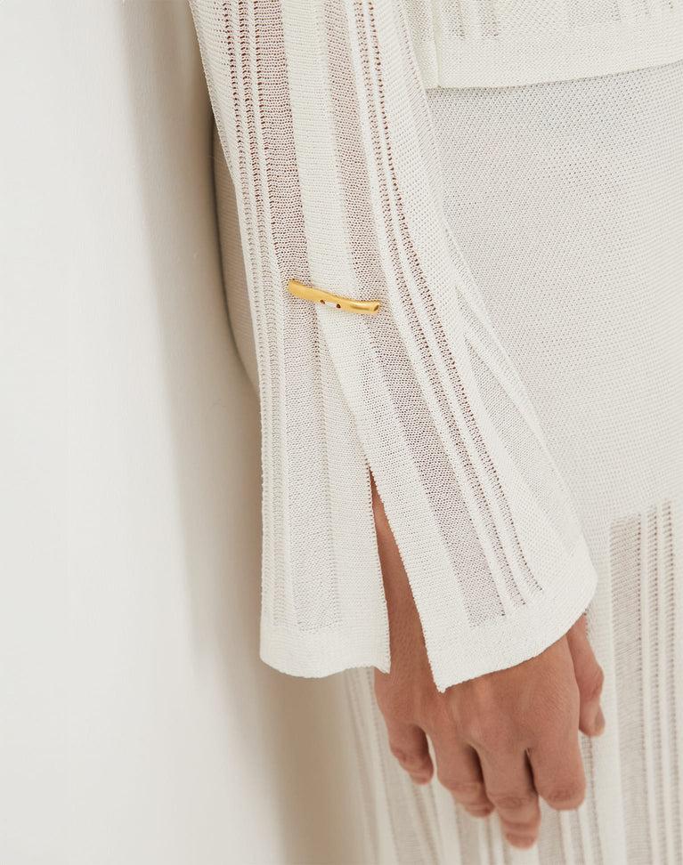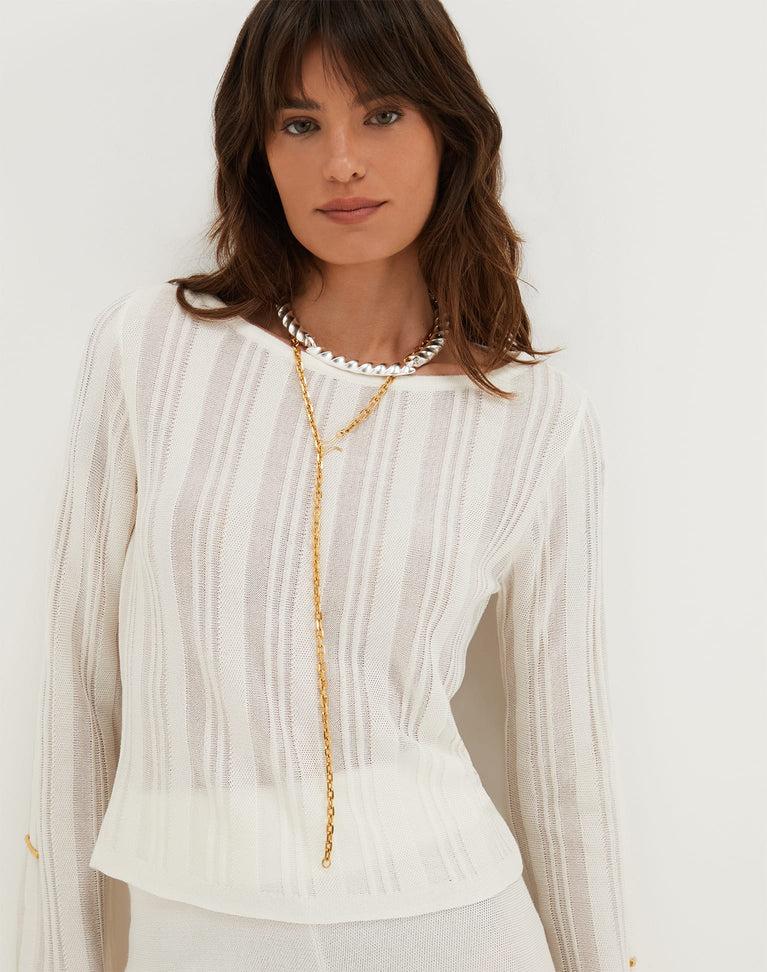 The ViX Knit Malene Blouse is a refined piece featuring a boat neckline, long sleeves with flared cuffs and subtle slit accents, all finished with sleek vertical stripes for a touch of sophistication. Style the Malene Blouse with matching bottoms or jeans and sandals for a vacation-ready look. Features: Boat neckline L