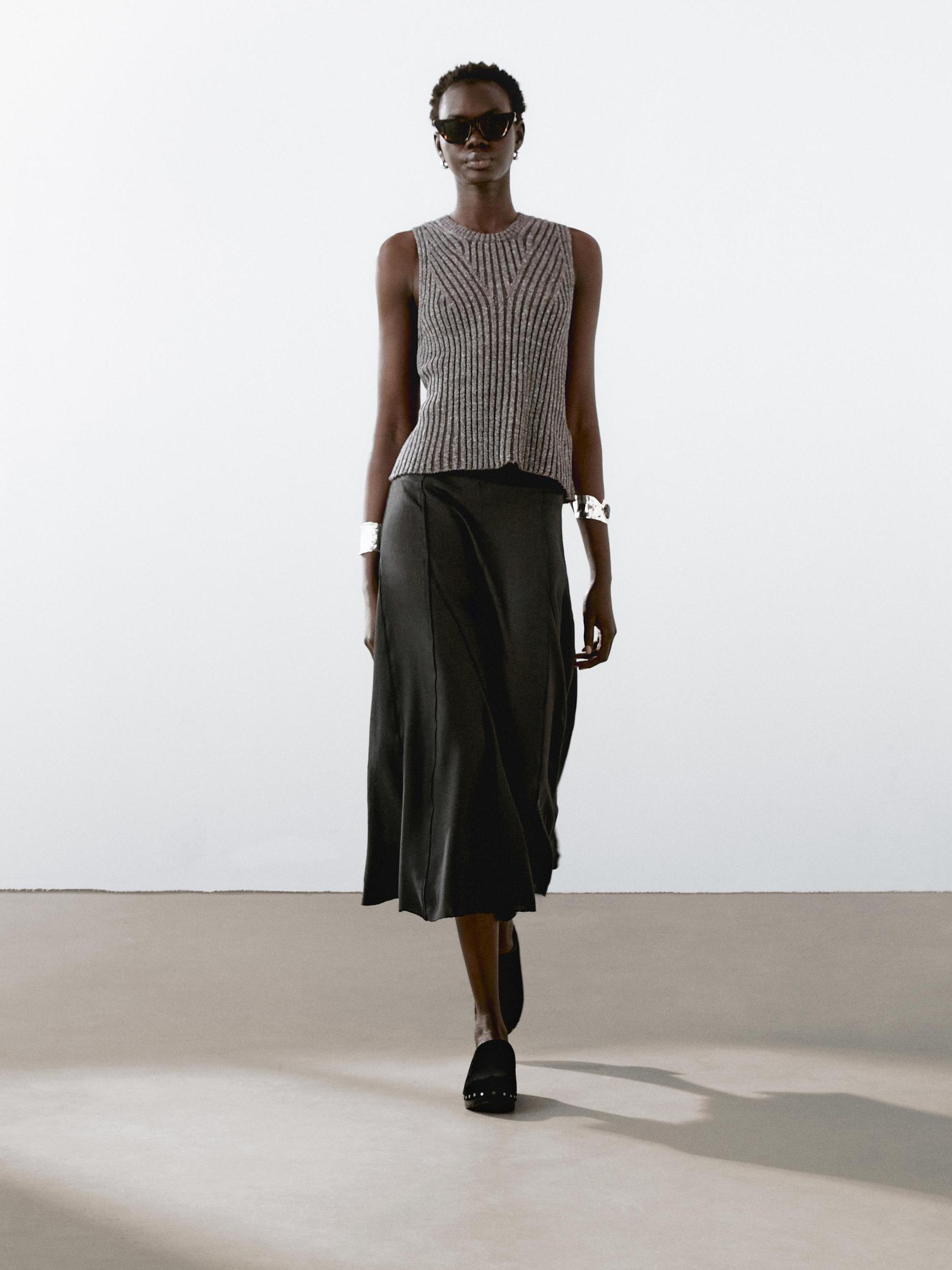 Top made of a linen blend fabric, Crew neck, Sleeveless, Ribbed trims , Flecked-effect finish, Knit fabric