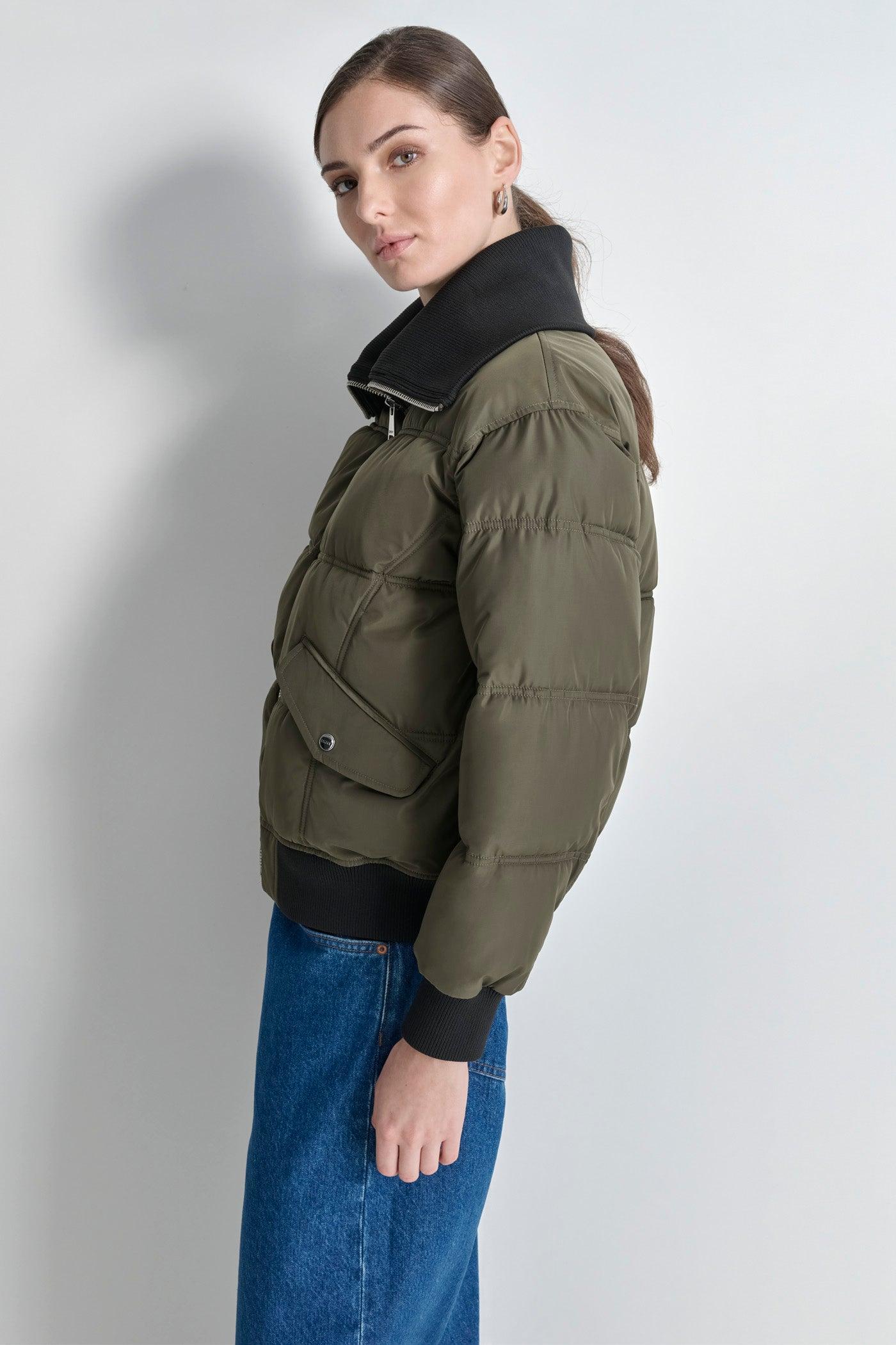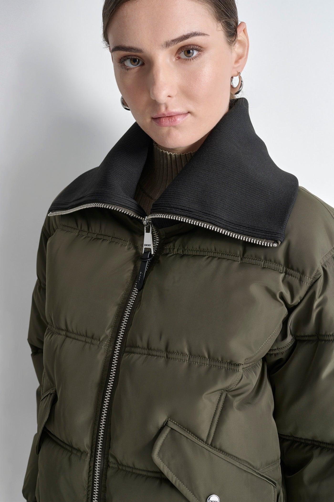 KNIT-TRIM ZIP-FRONT PUFFER COAT