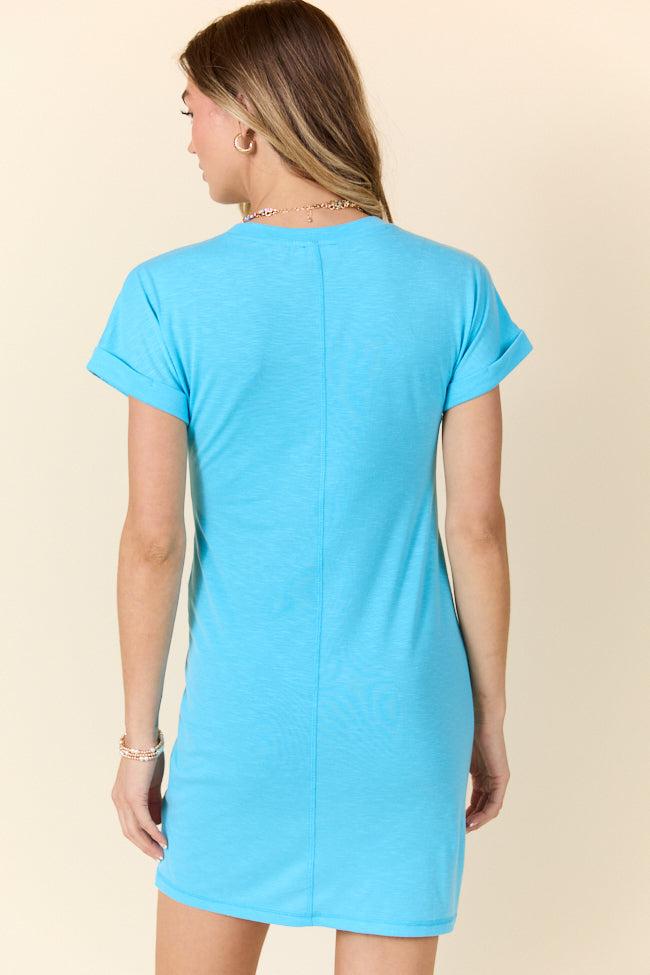Details T-Shirt Dress Fabric has stretch Crew neckline, short cuffed sleeves, knot detail Unlined Size small from shoulder to hem: 32" Material and Care 100% polyester Machine wash cold, line dry Patterns may vary Materials may have natural variations Colors may vary from different viewing devices.