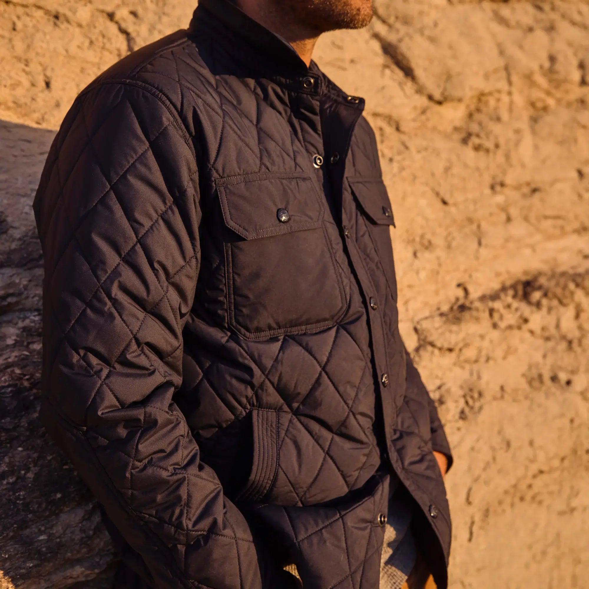 This Utilitarian-inspired shirt jacket from Double RL is made from 100% recycled polyester and features a diamond-quilted construction with a lightweight down-alternative fill to provide extra warmth. It has a traditional fit that runs true to size and comes with a pair of chest pockets, two angled waist pockets, a sli
