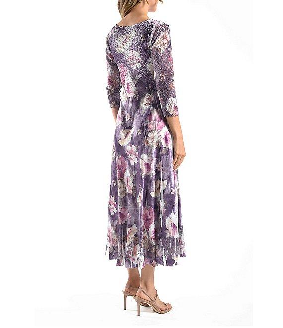 Komarov Morning Glory Floral Lace 3/4 Sleeve Charmeuse and Lace Midi Dress