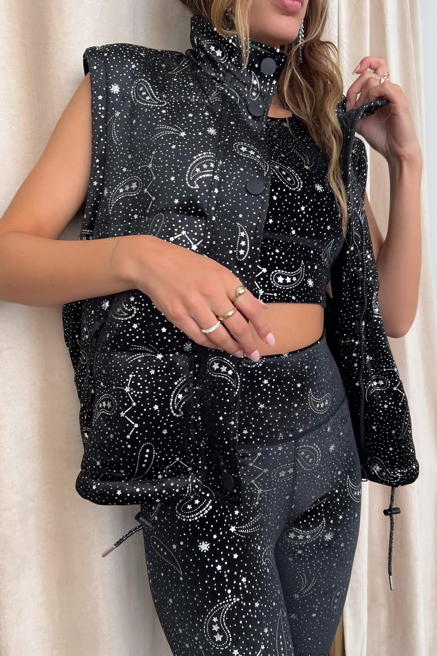 Introducing The Kris Convertible Puffer Jacket, the perfect transitional piece for the season. This effortlessly cool jacket comes in a luxe soft velvet fabric with a celestial foil print and puffed detailing to keep you cozy. With a cropped adjustable fit with a cording hem, 2-way zipper with snap front, high neck and front pockets. The best part is you can unzip the sleeves and it turns into the perfect puffer vest to keep you warm from studio-to-street. This is the quintessential outerwear piece for the changing seasons. 100% POLYESTER FINAL SALE