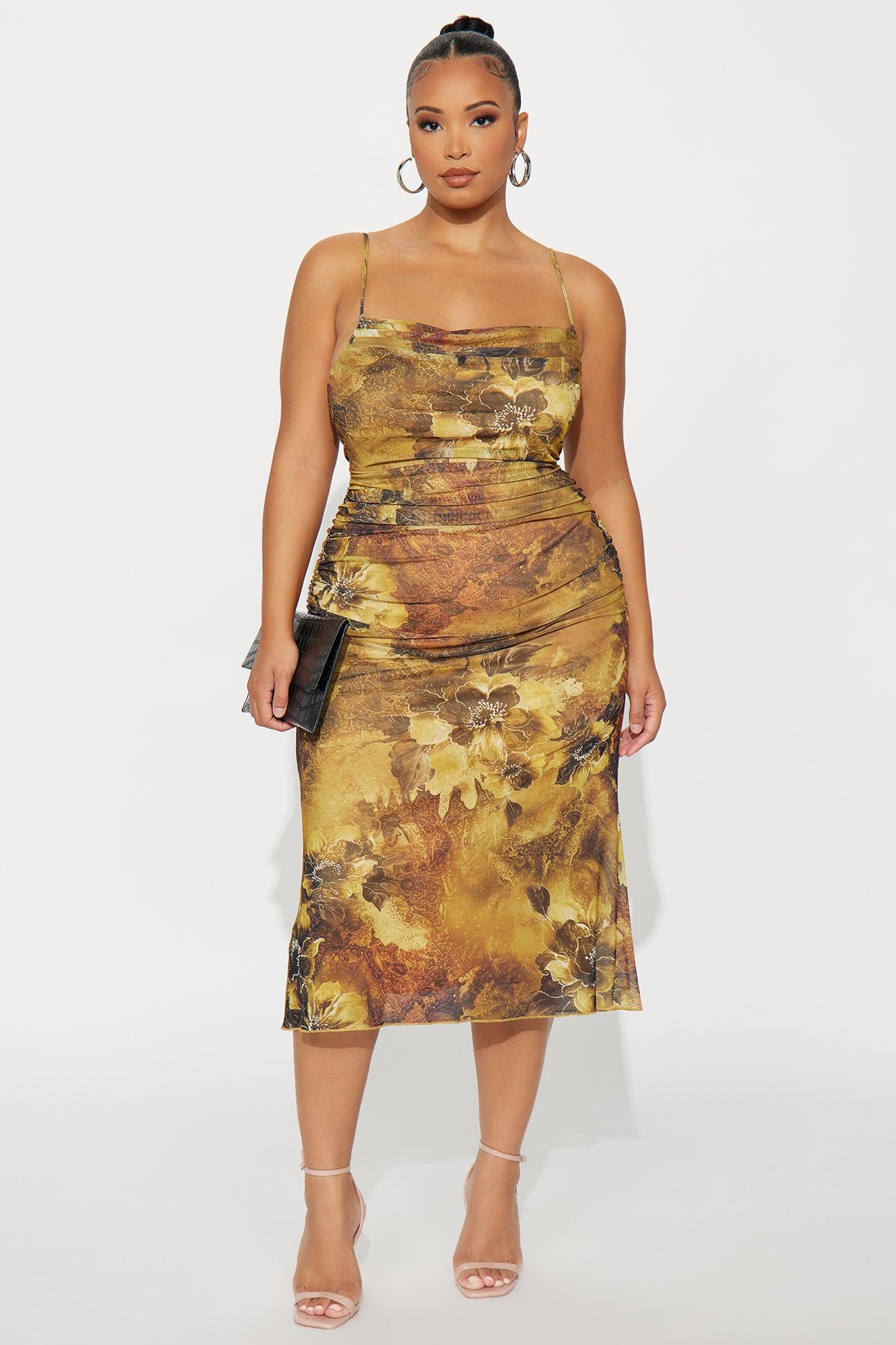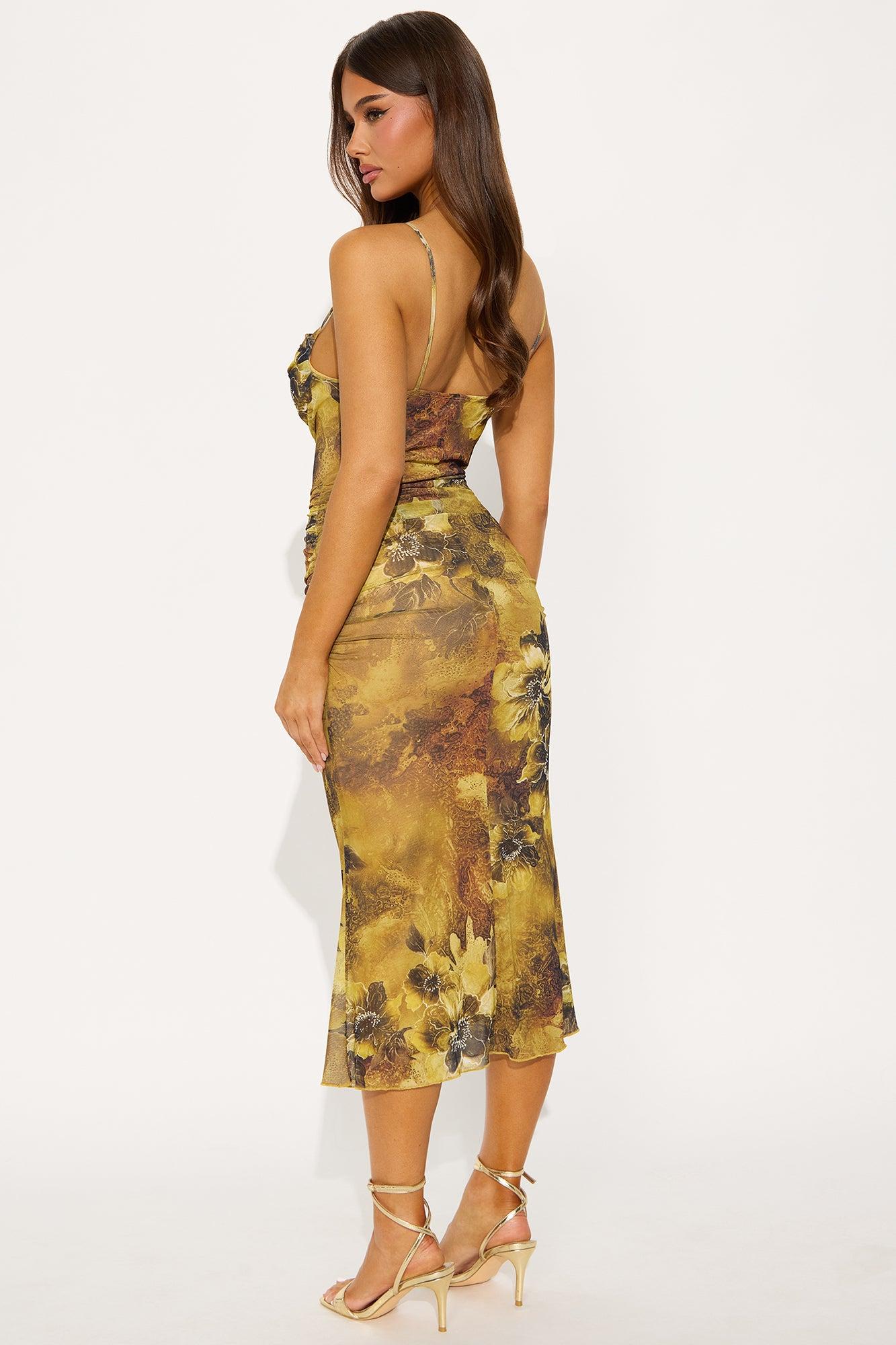 Available In Yellow/combo. Midi Dress Spaghetti Straps Straight Neckline Ruched Lined Stretch Length Measured Flat = 45" Disclaimer: Print Placement Will Vary. Self: 95% Polyester 5% Spandex Lining: 100% Polyester Imported California Proposition 65WARNING: Cancer and Reproductive Harm - www.P65Warnings.ca.gov.