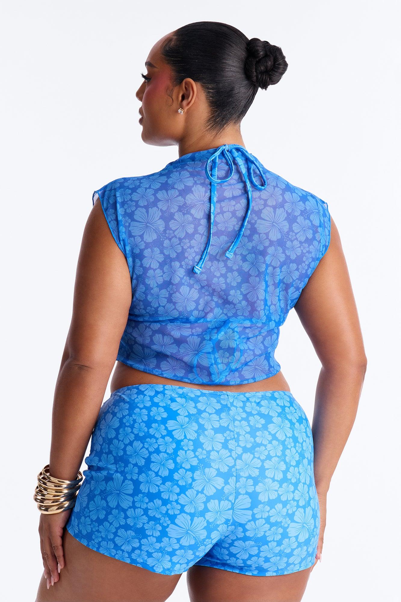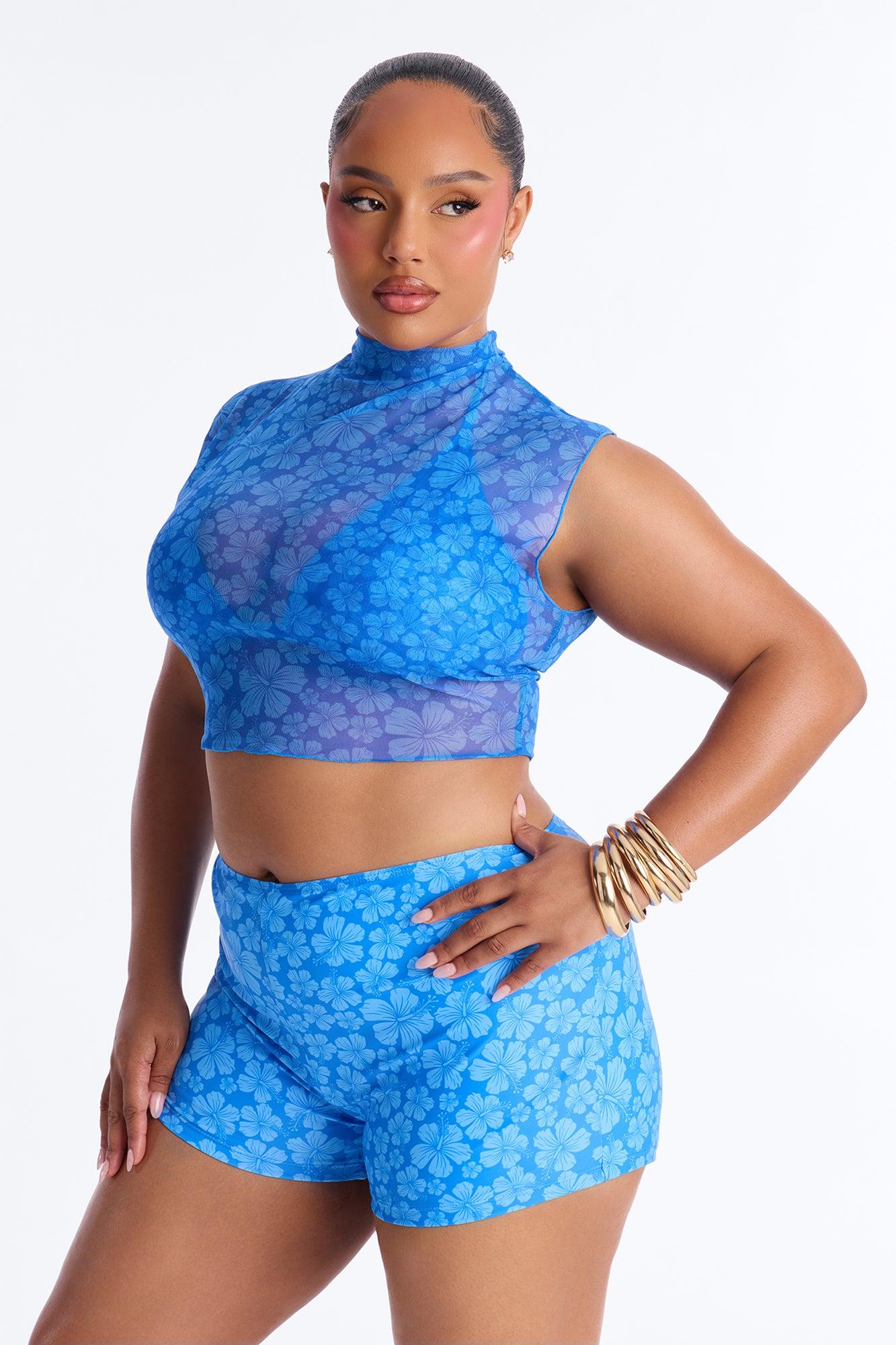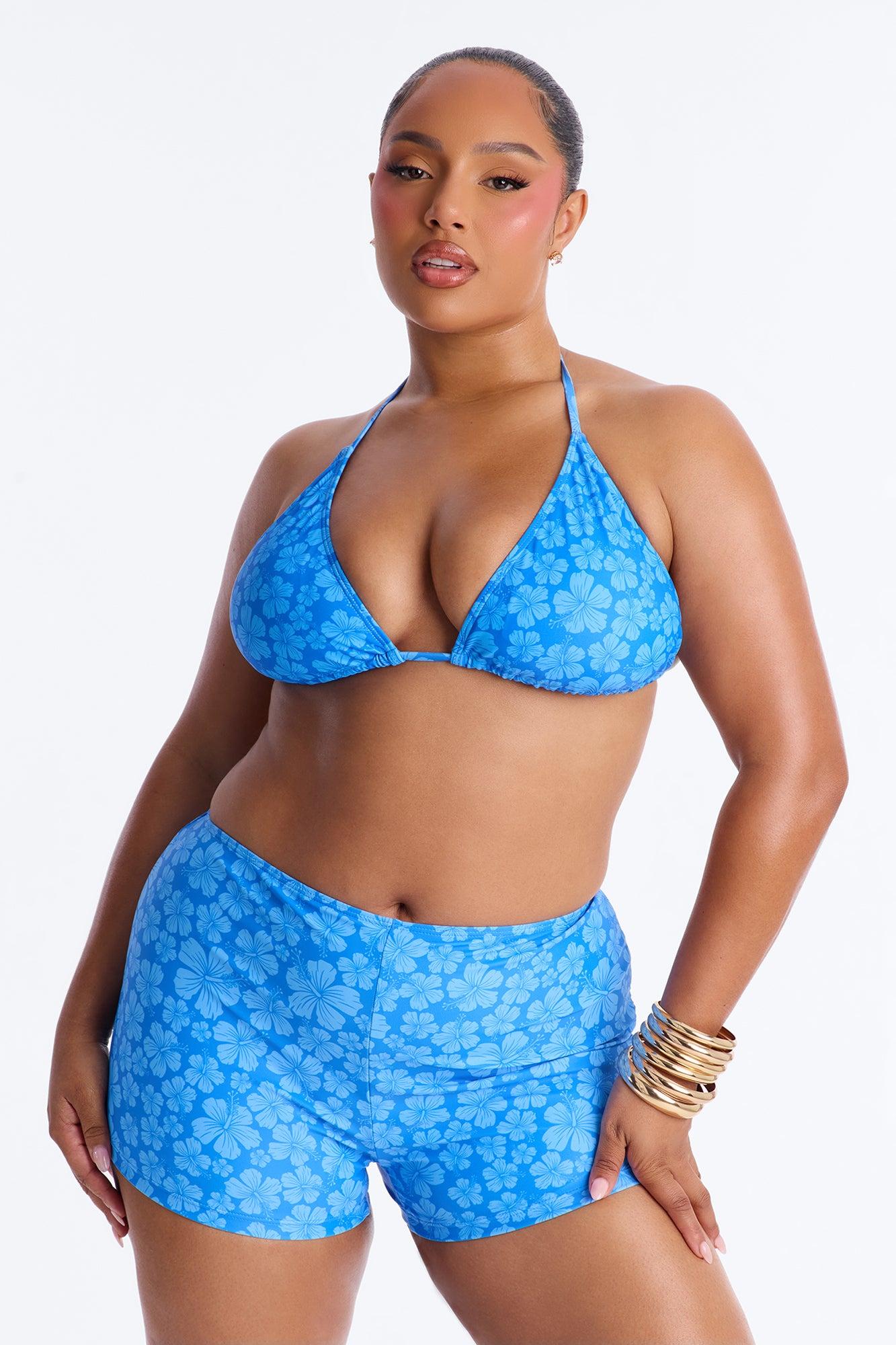 Available In Blue/combo. 3 Piece Bikini Set Floral Print Baby Tee Bikini Top Short Sleeve Triangle Bikini Top Removable Cups Boyshort Bikini Bottom High Waist Full Stretch Final Sale Bikini & Shorts Self : 82% Polyester 18% Spandex Bikini & Shorts Lining : 90% Polyester 10% Spandex Baby Tee : 95% Polyester 5% Spandex Available In Plus Sizes
