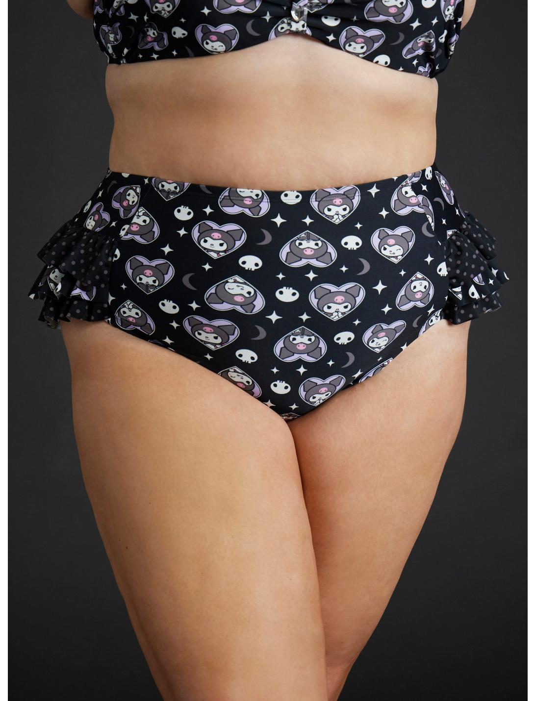 Keep your beach look devilishly cute with these Sanrio swim bottoms! Features Kuromi in a celestial heart print all over. Comes with cinch tie straps and two layers of ruffles. Pair them with the matching top for the ultimate beach day vibe!Top not included.Swimwear can only be returned unworn with original tags intact and sanitary panel in place.82% nylon; 18% spandexHand wash cold; dry flatImportedModel is 5'7"Model wears size 1