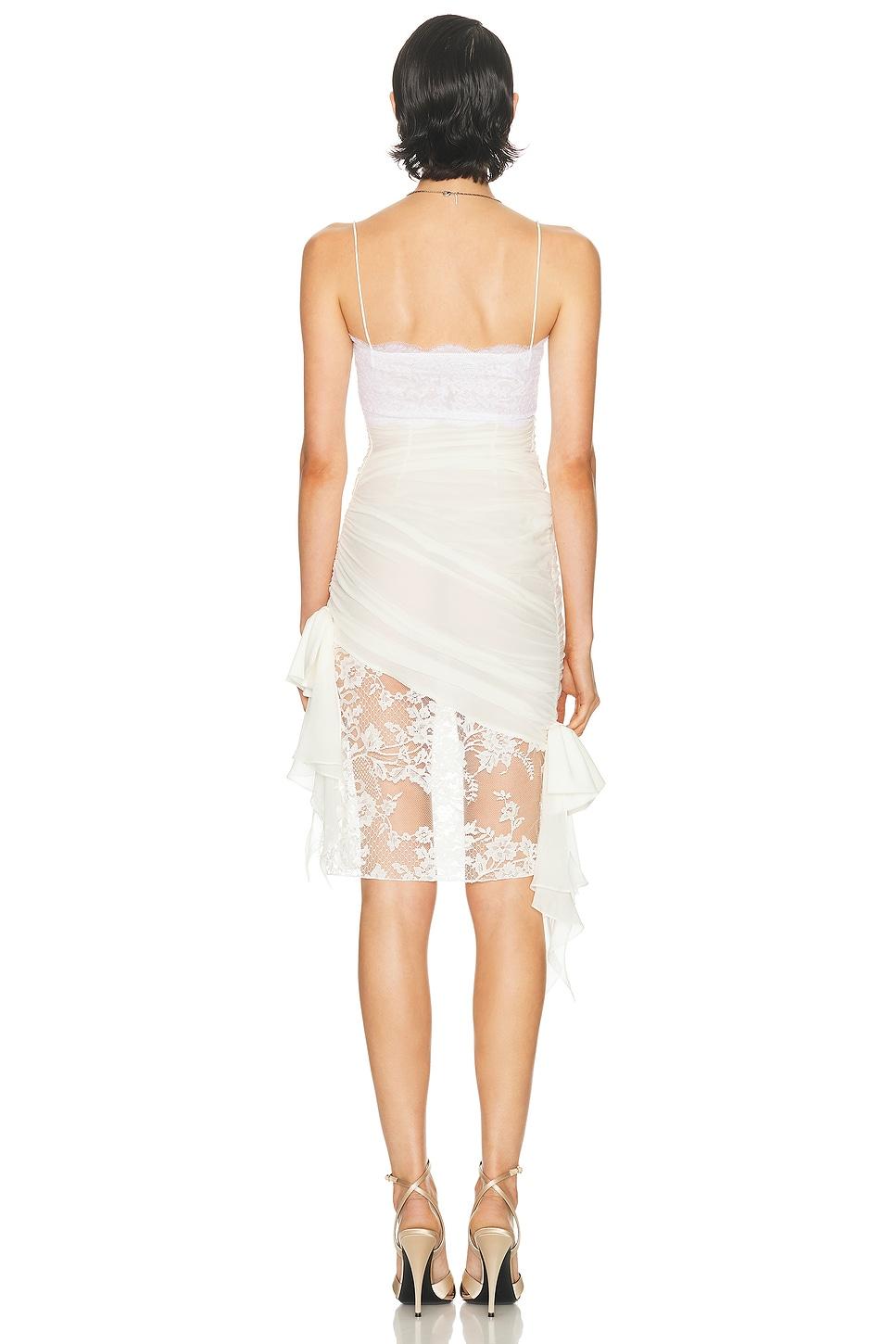 dressSelf 1: 100% silkSeld 2: 75% cotton, 25% polyamideSelf 3: 72% polyamide, 28% viscoseLining: 100% silk / Made in Italy / Specialist dry clean only / Fully linedGarment is made with a semi-sheer fabric, undergarments can show through / Hidden side zipper closure / Chiffon textile with lace trims / Draped designDecorative bows at sides / Our Style No. ARIF-WD181 / Manufacturer Style No. FABX4123 / Model is wearing size 36.