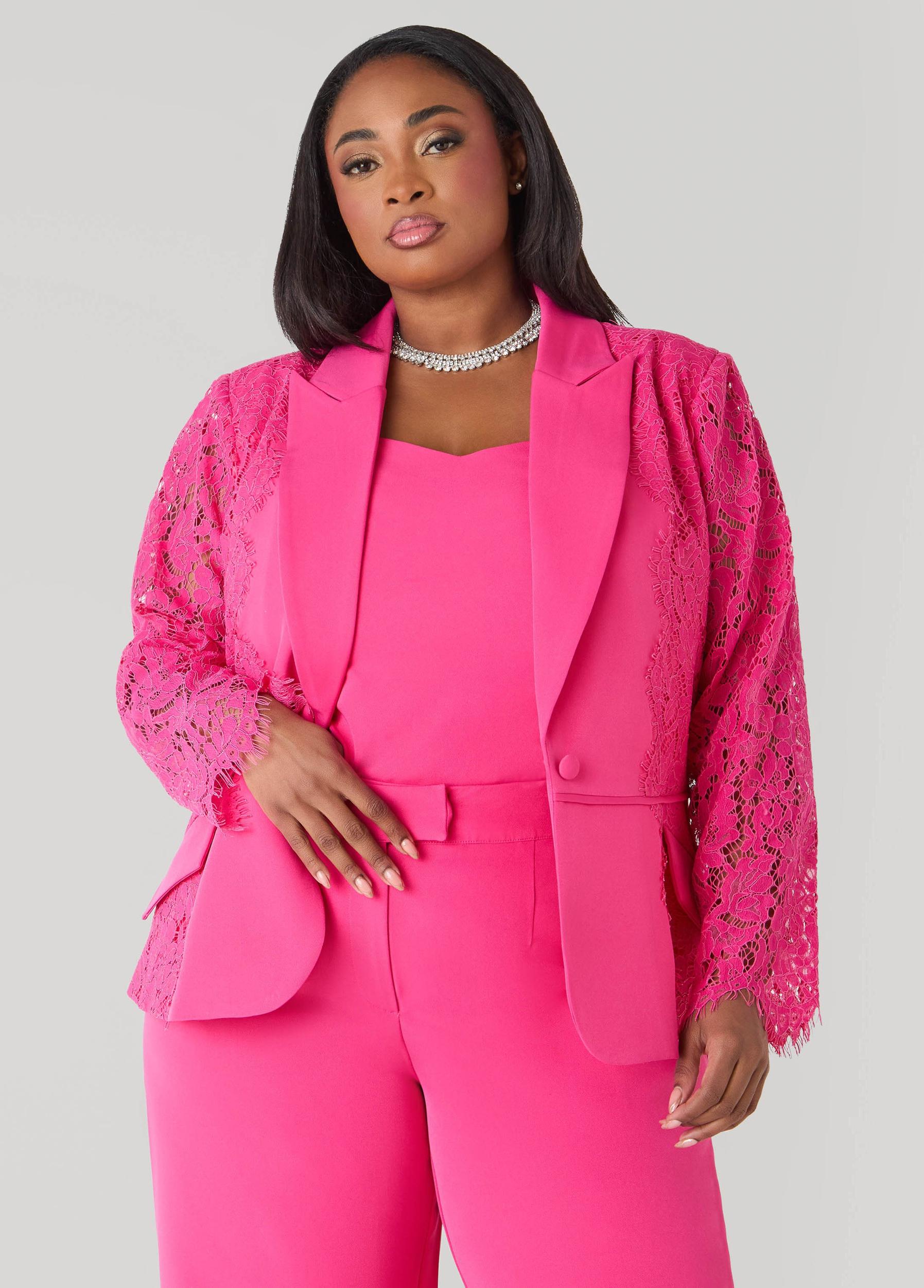Bring the power in pink with our crepe blazer. Corded lace panels and sleeves give it that sultry kick while the clean lines and faux pockets keep the look sophisticated. Throw it over the matching bustier and trousers for a three-piece set that walks in like it already owns the floor.