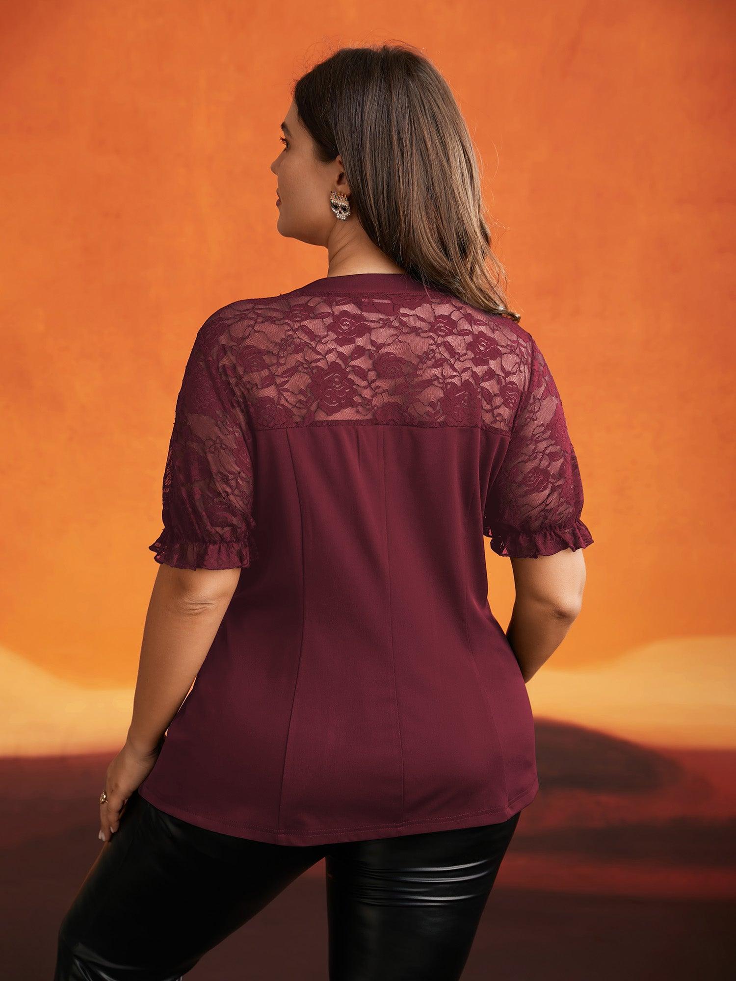 Shop Lace Tie Cutout Neck Mesh Blouse now and redefine your style with confidence at BloomChic. Tailored for mid and plus-size women. This trendy Tops Women, sizes 10-30. Color:Burgundy;Style:Elegant;Prints:Non;Neckline:Round Neck;Sleeve Type:Lantern Sleeve;Details:See through, Tie knot, Patchwork;Pocket:No-pocket