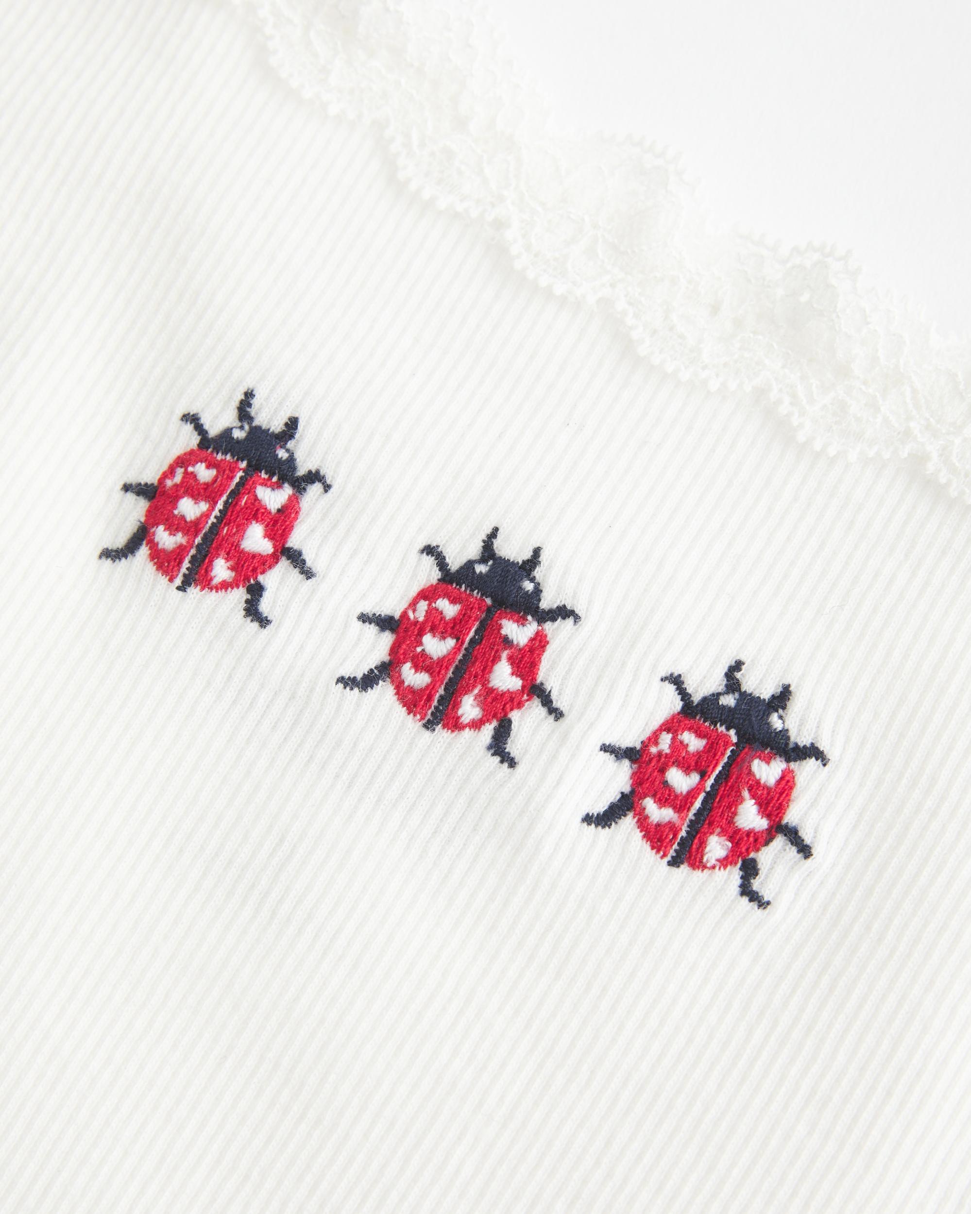 This cute and comfy tank features pretty lace trim at the neckline and embroidered ladybug graphics. Super soft ribbed fabric, adjustable straps. Slim Fit.