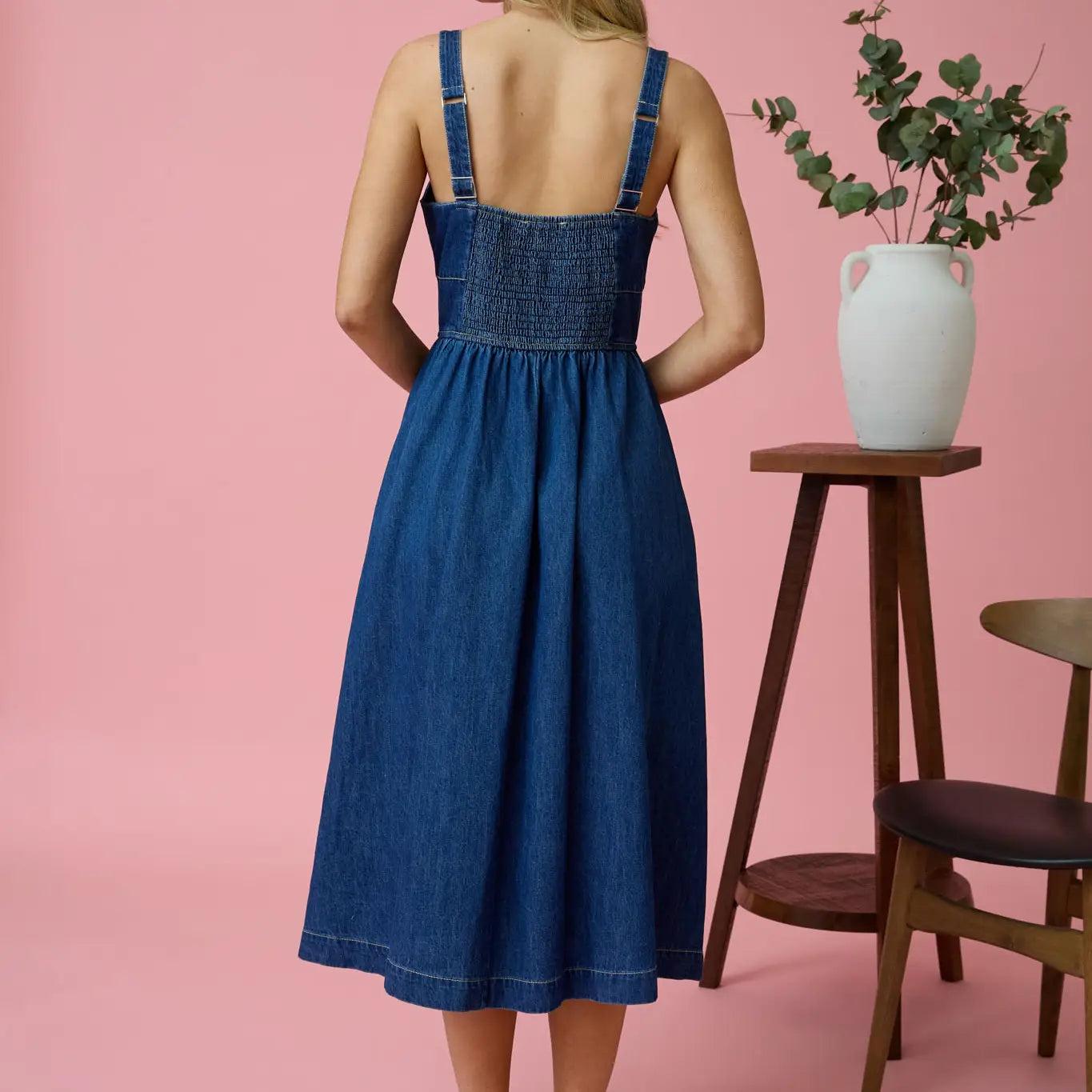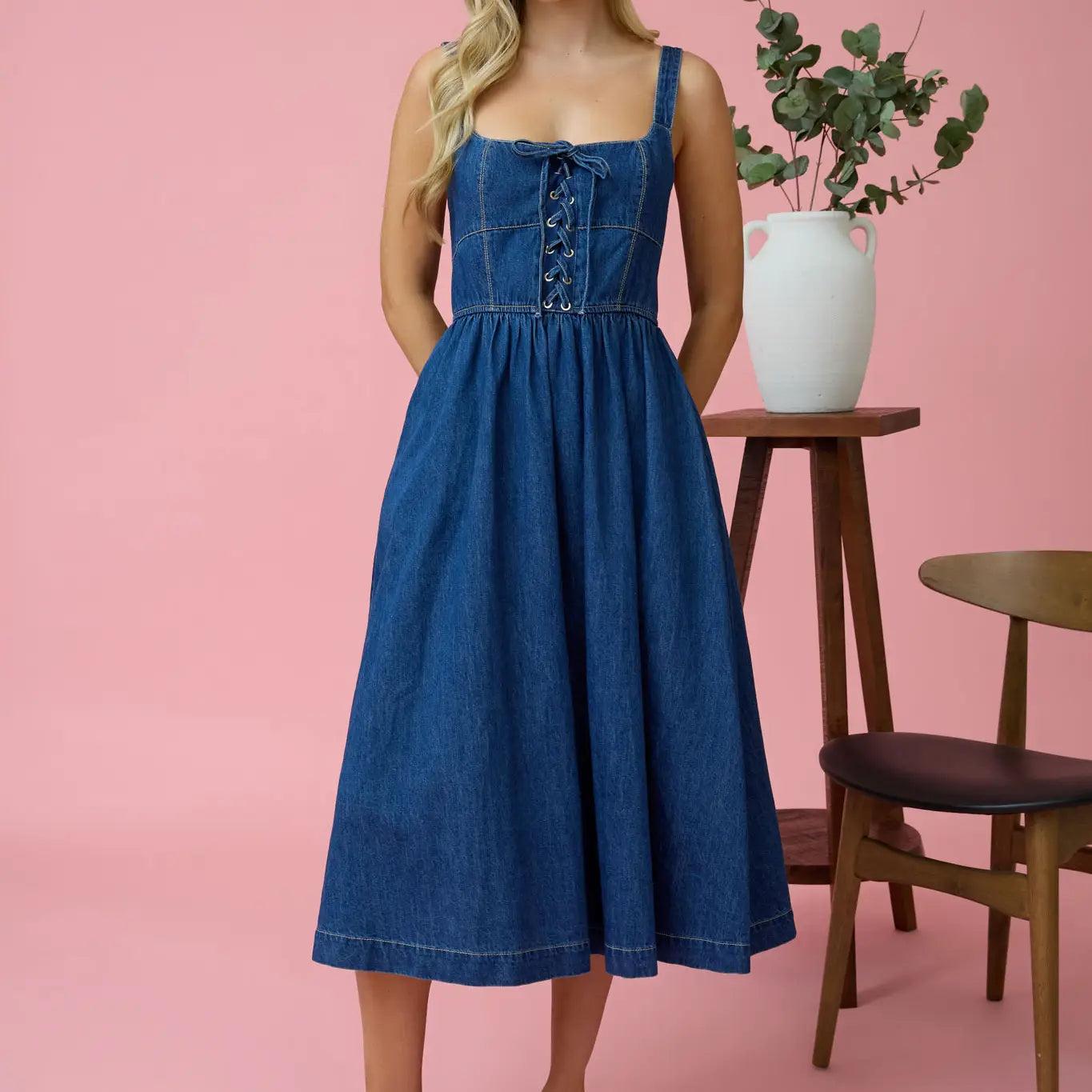 Create an alluring look with this stunning Lace Up Sleeveless Denim Midi Dress with Pockets. Featuring a Square Neckline, adjustable straps, corset detailing, and grommet accents, this A-line dress is designed to elevate your style. The back smocking and solid denim pattern add an extra touch of sophistication to this not-lined dress. Made with 100% cotton, this dress is both comfortable and stylish, making it a must-have for your wardrobe. Available in Small to Large. Material: 100% cotton. Machine Wash Cold Inside Out. Hang to Dry.