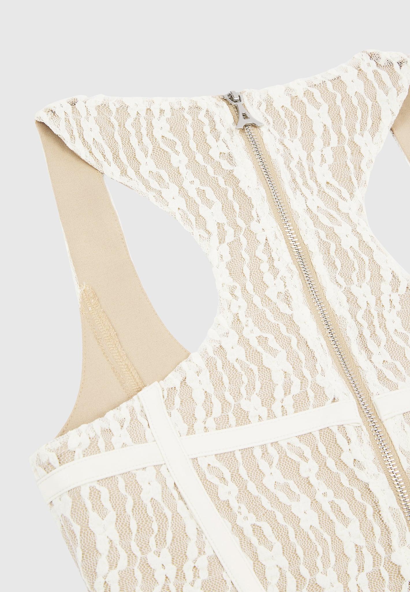 This patterned mesh corset top offers a contemporary update to an iconic style. The beige lace overlay adds a delicate touch while the vegan leather boning provides a modern look and structure. Showcase your style while maintaining a sophisticated look. Corset Top Silhouette Lace Overlay Vegan Leather Piping Dipped Hem Silver Manière De Voir Eiffel Zip 65% Viscose, 30% Polyester, 5% Elastane / 88% Polyamide, 12% Elastane / 55% Polyester, 45% PUAlways check the care label for wash instructions.