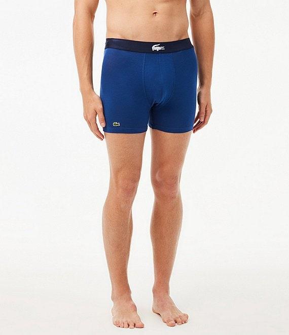 From Lacoste, this 3-pack features: (1) x solid pair of boxer briefs with "Lacoste" wording on one leg and a wraparound big crocodile graphic on the other leg (2) x solid pairs of boxer briefs with embroidered crocodile branding at one leg hem Both have embroidered crocodile branding at the waistband 5" inseam Stretchy cotton/elastane for ultimate comfort Machine wash/tumble dry Imported.