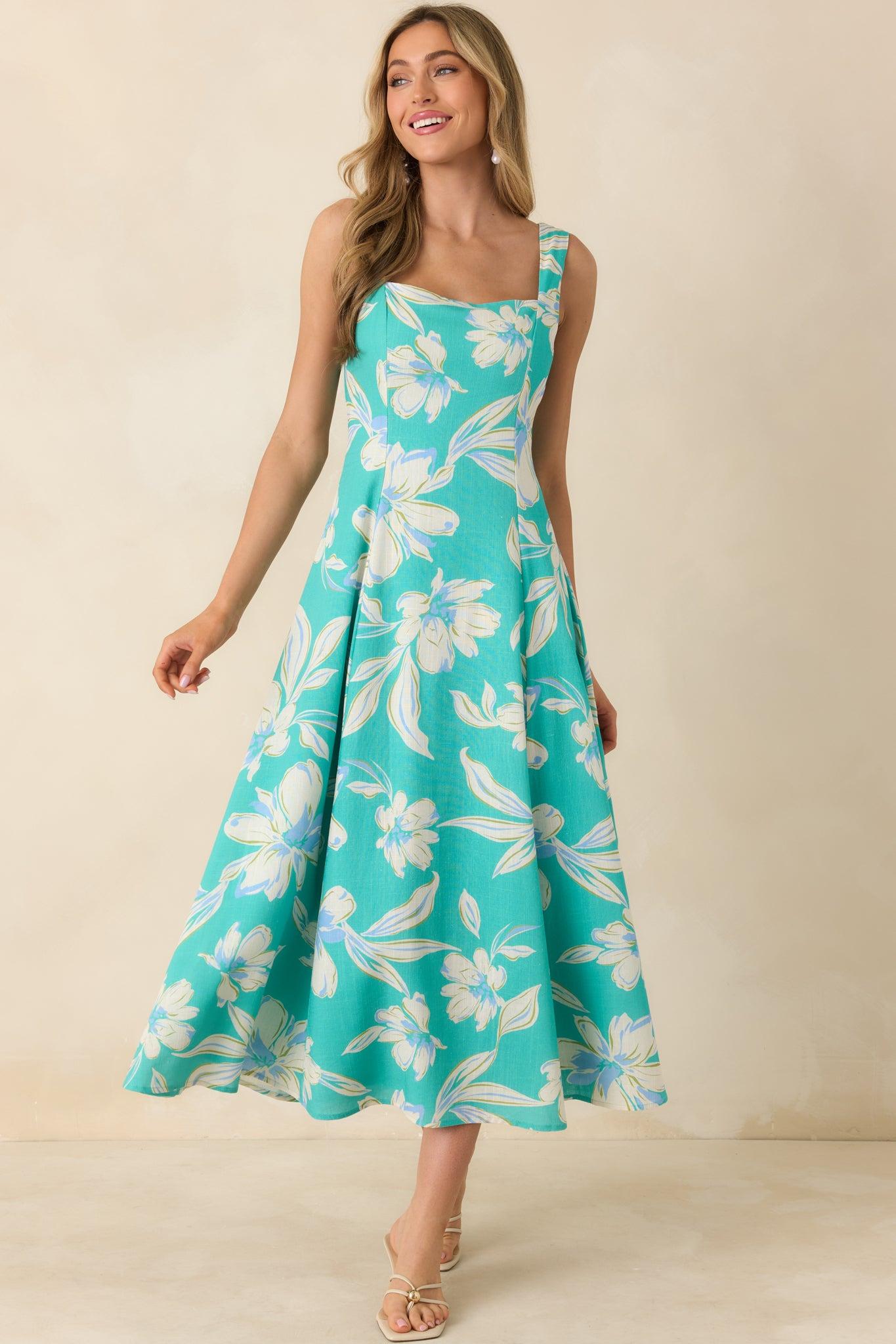 Like sunlight dancing across clear coastal water, the Laguna Bloom Turquoise Multi Floral Sleeveless Midi Dress captures that effortless, just-arrived-on-vacation glow. The vibrant turquoise backdrop sets the stage for oversized, painterly florals in soft ivory and sky blue, creating a look that feels both fresh and refined. With its clean square neckline and graceful A-line skirt, this dress moves beautifully from brunch by the marina to sunset dinners under string lights. This turquoise sleeveless midi dress features a structured square neckline with wide straps and a tailored bodice for a flattering, feminine fit. The fitted waist flows into a softly flared A-line skirt for easy movement and all-day comfort, while a concealed back zipper ensures a smooth silhouette. 70% Rayon & 30% Linen Lining: 100% Polyester Hand Wash Cold Manufactured in China Designed in The USA Model is 5'8" and Wearing a Size Small, Clipped, Model is a True X-Small