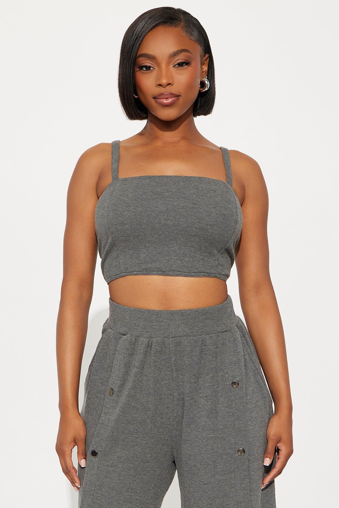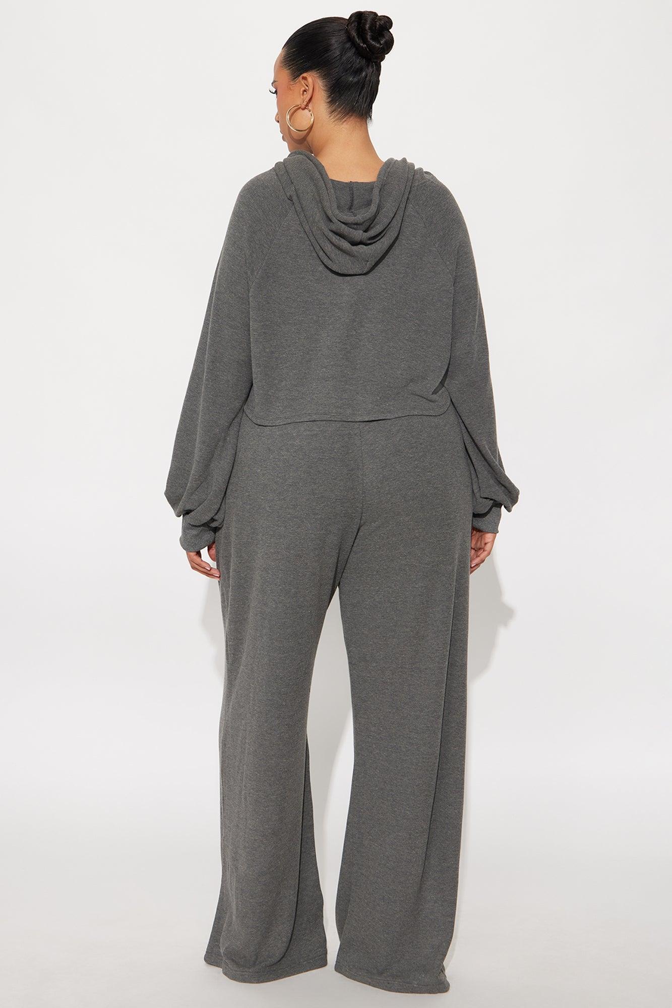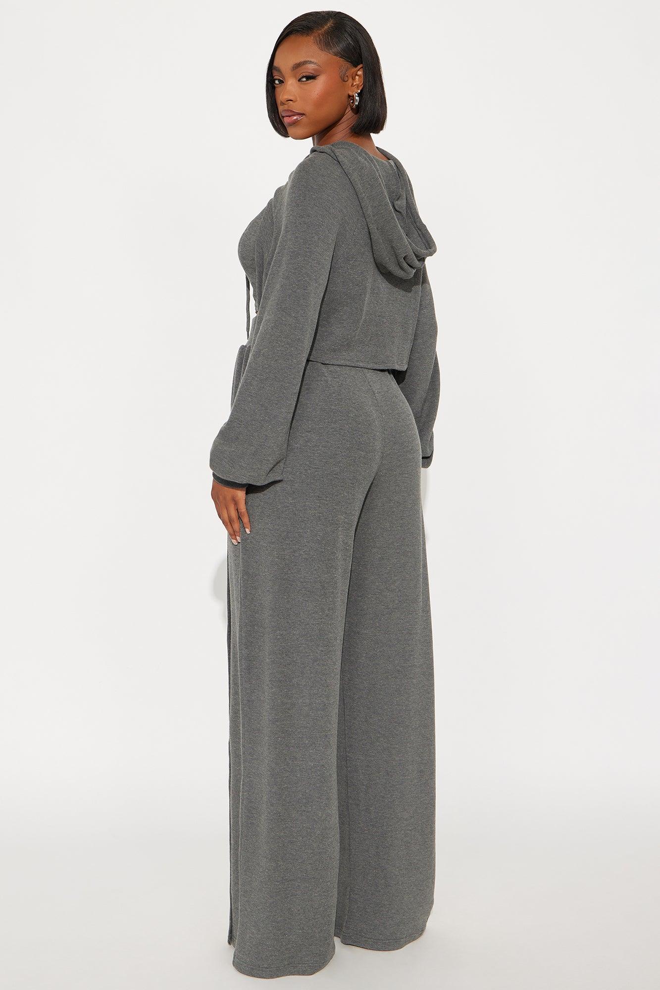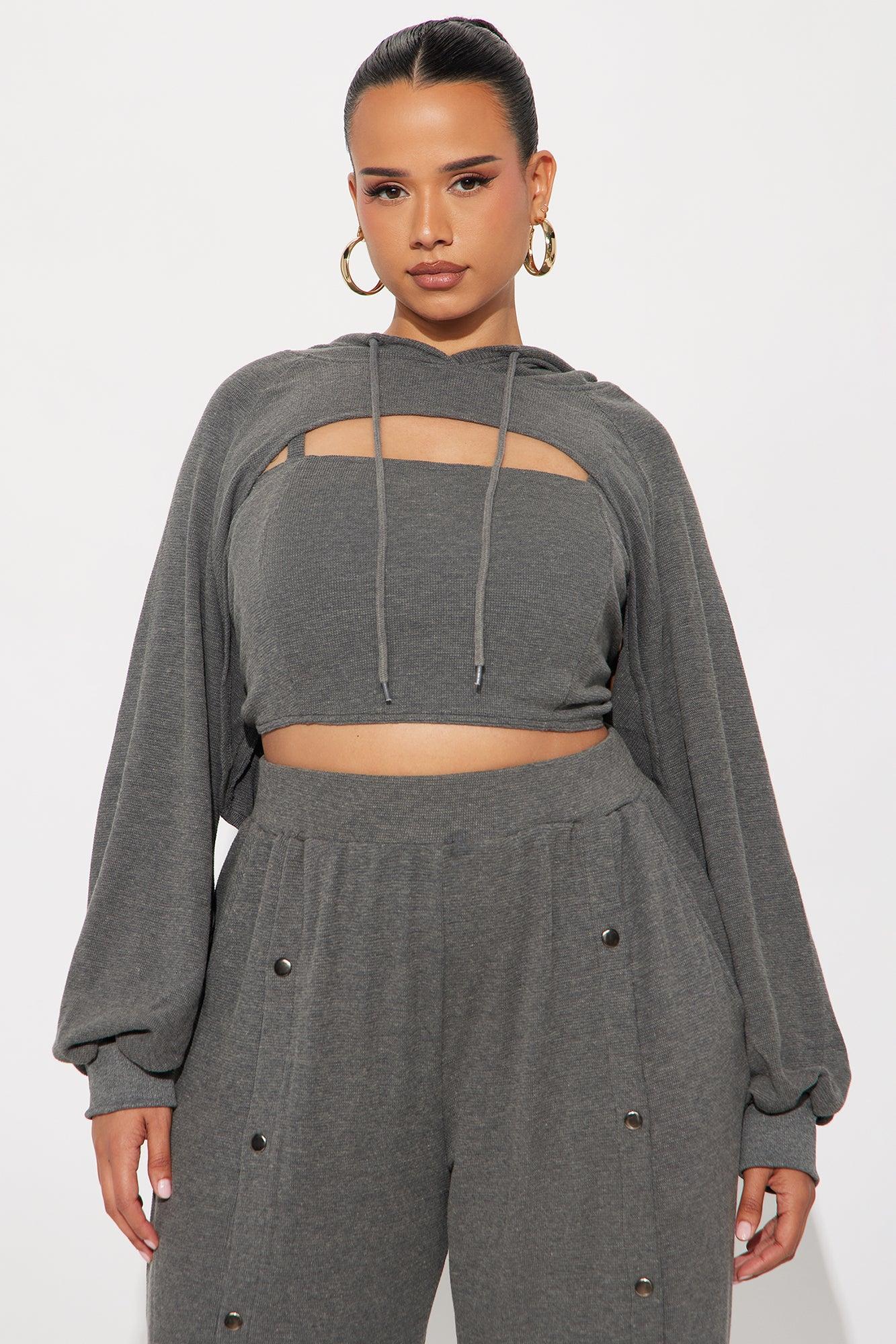 Available In Charcoal. 3 Piece Ensemble Tube Top And Wide Leg Pant Set With Cropped Hoodie Stretch 33" Snap Button Pant Closure Elastic Waistband Pockets Self: 63% Polyester 34% Cotton 3% Spandex Contrast: 100% Polyester Imported California Proposition 65WARNING: Cancer and Reproductive Harm - www.P65Warnings.ca.gov.