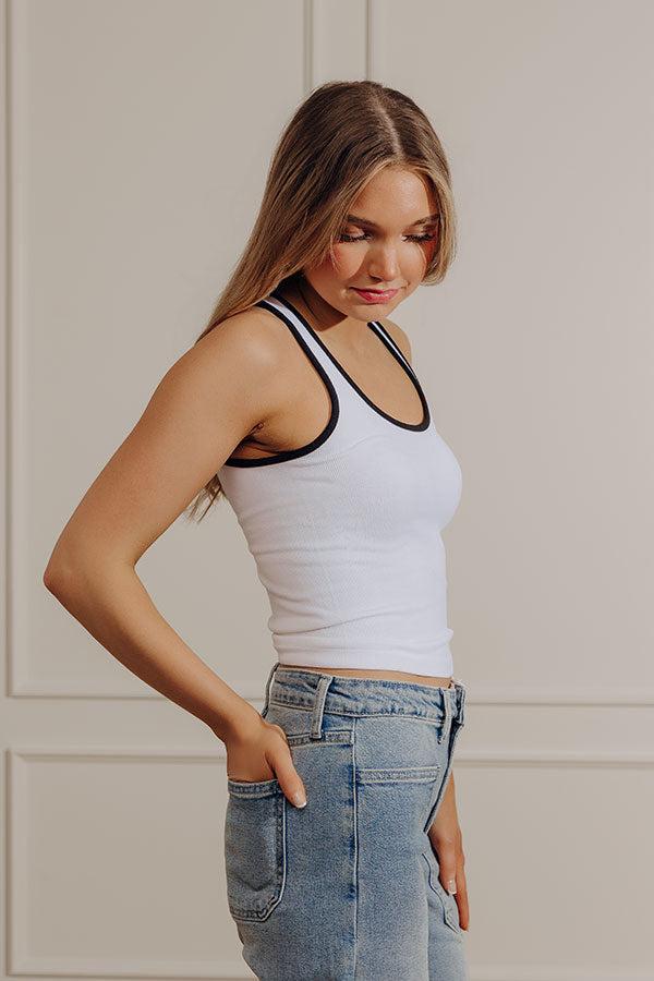 - Update your casual essentials with this cute varsity-style ribbed tank! The flattering fit and timeless design make it a go-to piece you'll reach for again and again. Whether you're out for a morning jog or headed to a lakeside picnic, this one is a must-have! - Unlined ribbed knit material with black trim - A scoop neckline - A sleeveless cut - A flattering silhouette that ends in a straight hemline
