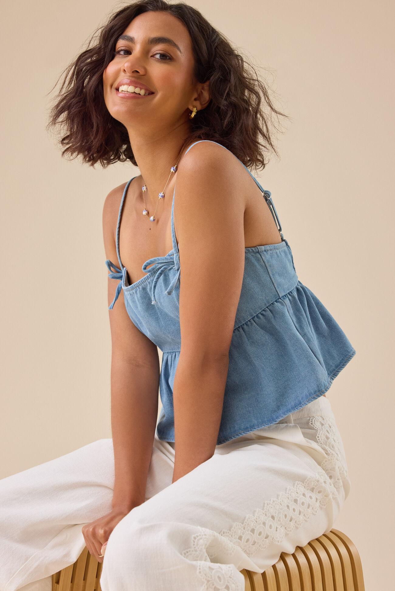 This tank top combines the charm of a babydoll silhouette. The bow straps add a touch of playful detail, making this a unique and stylish piece.