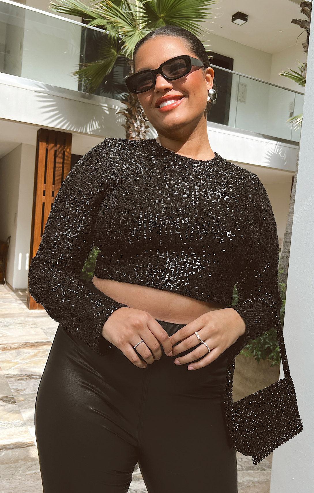 Introducing the Last Call Top - a burst of midnight glitz and style! This long sleeve top has an elastic neck and cropped hem. The ultimate party set paired with the All Night Skort, or styled with a high waisted black pant and oversized blazer.