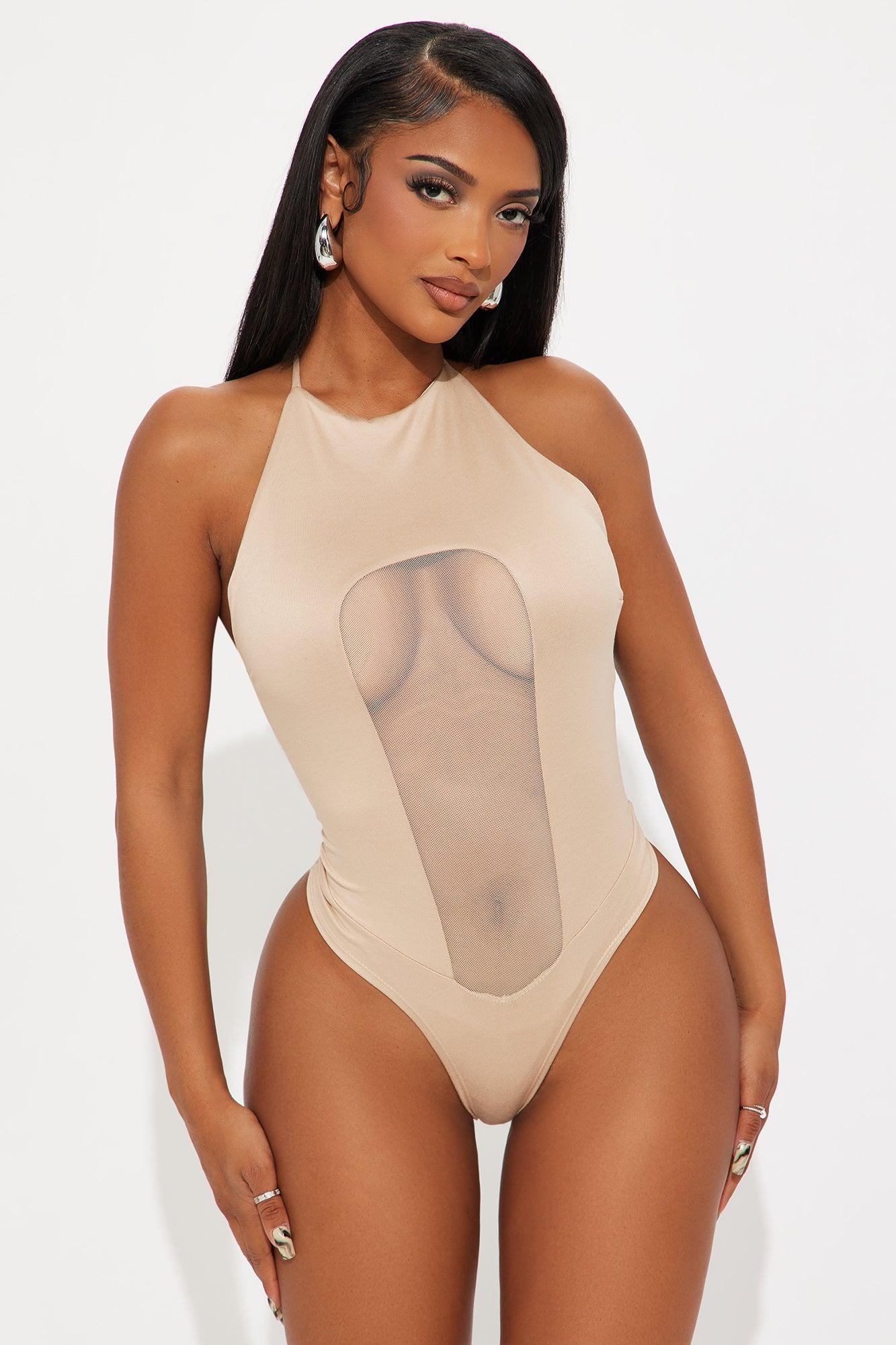 Available In Black And Nude. Halter Bodysuit Final Sale Stretch Tie Neck Mesh Cut Out Seaming Cheeky Bottom Snap Closure Self: 95% Polyester 5% Spandex Contrast: 95% Polyester 5% Spandex Imported California Proposition 65WARNING: Cancer and Reproductive Harm - www.P65Warnings.ca.gov.