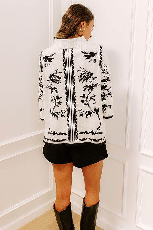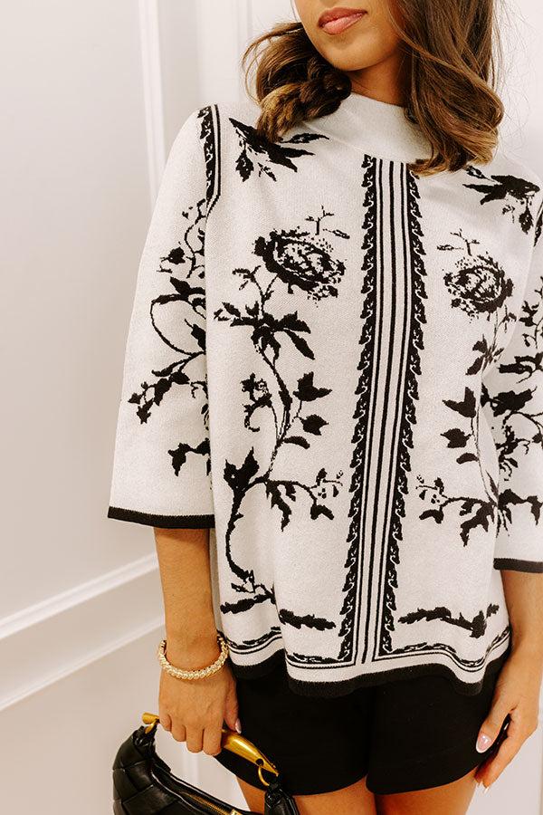 - Perfect for transitional weather, this chic floral top is a wardrobe must-have! Its trendy design makes it the perfect piece to style for everyday outings or dress up for more elevated looks. - Unlined knit material with a black colored floral design - A mock neckline - Loose, ¾ length sleeves - A relaxed silhouette that ends in a straight hemline Measurements S : Bust 42", Hip 46", Length 23", Sleeve Length 16", Waist 44". M : Bust 44", Hip 48", Length 23.5", Sleeve Length 16", Waist 46". L : Bust 46", Hip 50", Length 24", Sleeve Length 16.5", Waist 48".