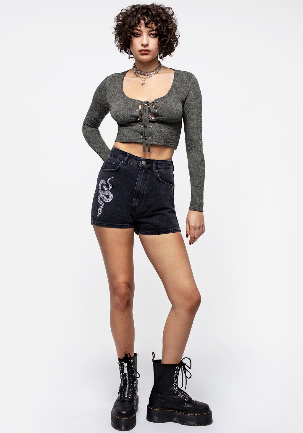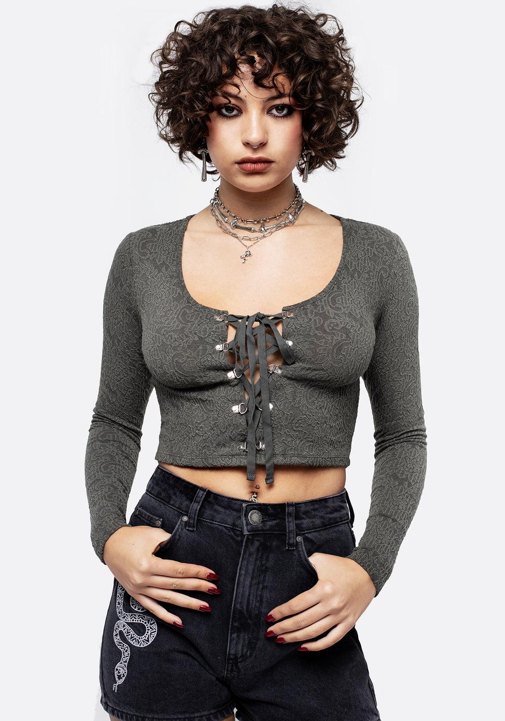 Your crowning glory- Green lace-up long-sleeved crop top - Cropped fit with adjustable lace-up front feature (size down for a closer fit) - Soft scooped neckline & comfy long sleeves - Open lace-up front with silver looped eyelets - Self-fabric ties through silver eyelets tighten & fasten however you see fit - Green woven jacquard fabric with comfortable stretch - Wear alone for a peekaboo moment or layer over tops & dresses for a little extra - A winning formula 72% polyester, 28 elastaneEva is 5’10” and wearing a UK8 / US4