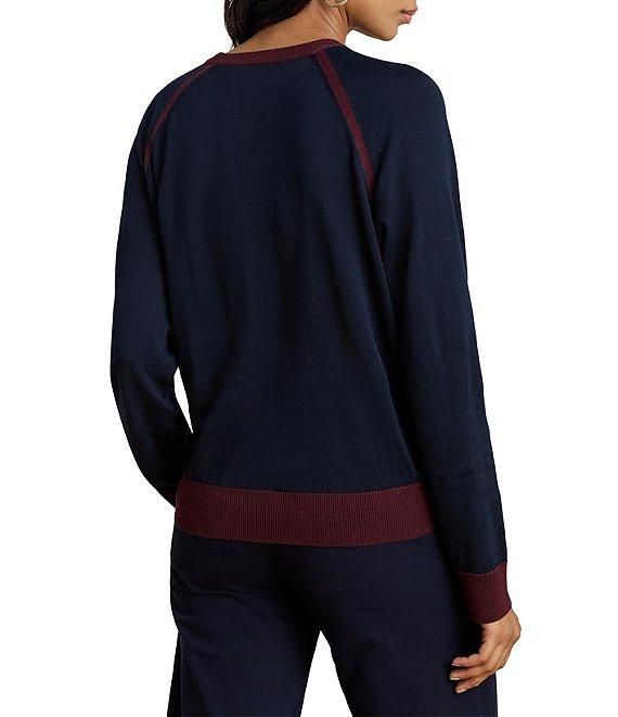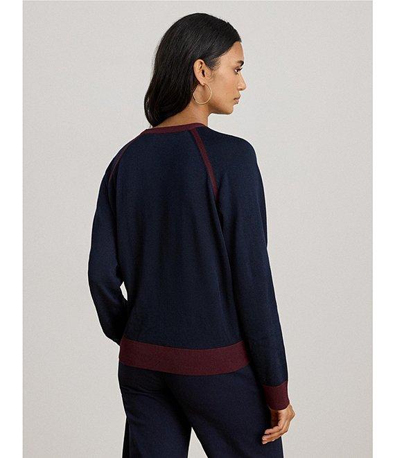 From Lauren Ralph Lauren, this sweater features: Cotton-blend fabrication Crew neckline Long raglan sleeves with ribbed cuffs Relaxed fit Equestrian-print Silky twill at the front and soft cotton-blend fabric at the sleeves and back body Intended to hit at the hip Ribbed hem Pullover construction Approx.23" length, 30.5" sleeve length Body length is taken from the high point of the shoulder. Sleeve length is taken from the center back of the neck Front body: polyester; back body and sleeves: cotton/modal Hand wash cold/flat dry or dry clean Imported.