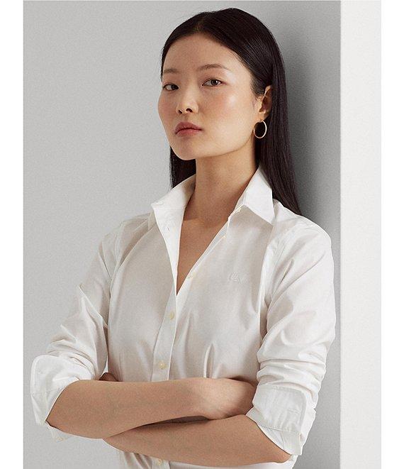 Treated with a no-iron finish, this classic shirt adorned with LRL embroidery is a wear-to-work must-have. From Lauren Ralph Lauren Petite, this shirt features: woven fabrication Point collar neckline Long sleeves with buttoned barrel cuffs Back yoke Signature "LRL" embroidery at the left chest Buttoned placket with signature "Lauren Ralph Lauren" buttons Shirttail hem button front closure Approx. 26" length Cotton/elastane Machine wash/tumble dry Imported.