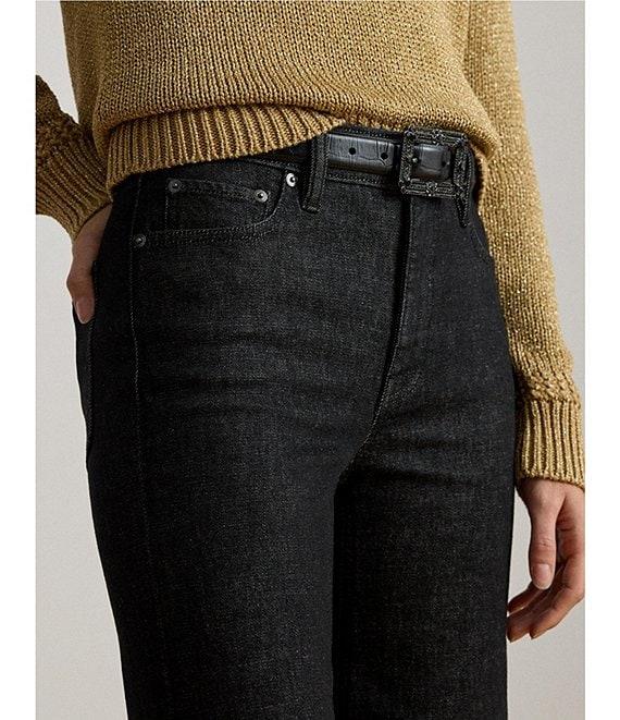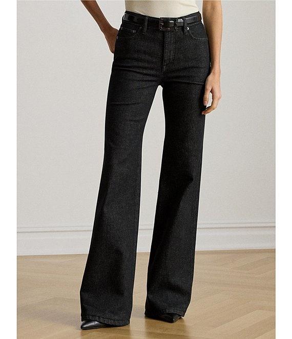 From Lauren Ralph Lauren, these jeans feature: Twill fabrication High rise Belt loops Wide leg silhouette 5 pocket styling Slim interior panels Lift and shape Full length Front button and zipper closure Approx. 32.5" inseam, 24.5 leg opening, 1.25" rise Cotton/elastane Machine wash cold/line dry Imported.
