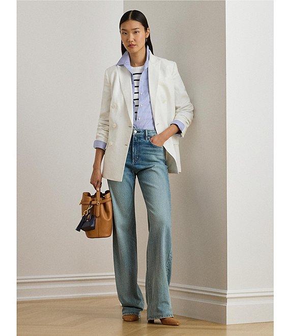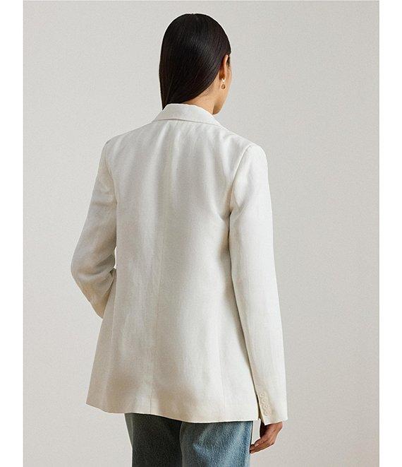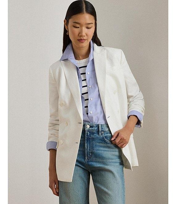 From Lauren Ralph Lauren, this blazer features: Linen-blend twill fabrication Double breasted silhouette Peak lapel neckline Long sleeves with four-button cuffs Shoulder pads Relaxed fit Intended to hit at the lower hip Two front waist flapped pocket Left chest angled welt pocket Front waist darts Front and back panel seams Fully lined Straight hem Button-front closure Approx. 28.25" length, 33.5" sleeve length, 0.25" between sizes Linen/viscose; lining: polyester Hand wash or dry clean Imported.