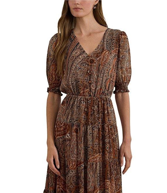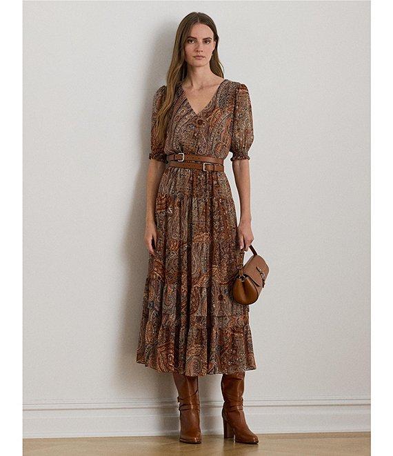 From Lauren Ralph Lauren Petite, this dress features: Georgette crinkle fabrication A-line silhouette V-neckline Puffed elbow-length sleeves with smocked cuffs Shirring into the sleeve caps Paisley print Threaded belt loops Comes with a removable self-belt Elasticized waist Tiered skirt Shirring into the waist and tier seams Fully lined except for the sleeves Intended to hit above the ankle Button-and-loop half-placket Approx. 50.75" body length and a 13" sleeve length Dress length is taken from the center back of the neck and changes 0.5" between sizes Sleeve length changes less than 0.25" between sizes Shell and lining: polyester Machine washable or dry clean Imported.