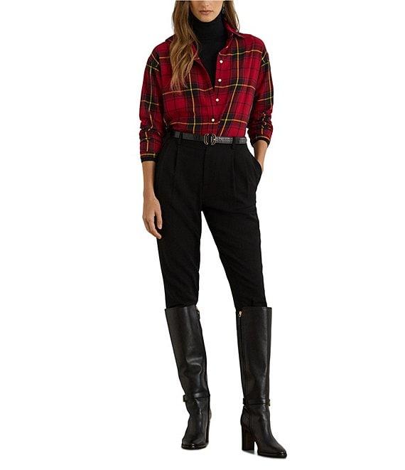 From Lauren Ralph Lauren Petite, this shirt features: Lightweight twill fabrication Checked plaid pattern Relaxed, easy fit Point collar Buttoned barrel cuff long sleeves Dropped shoulders Intended to hit at the hip Buttons custom-developed with a “Lauren Ralph Lauren” logo Back yoke Shirttail hem Button-front closure Approx. 28" body length, 31.5" sleeve length Cotton Machine washable or dry clean Imported.