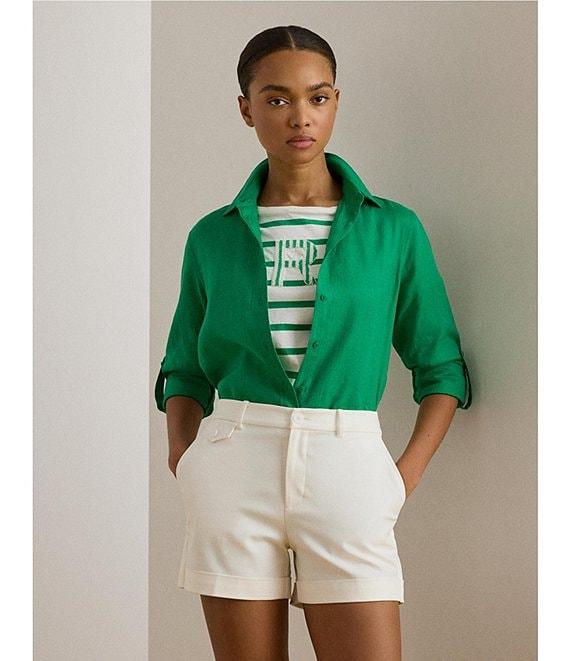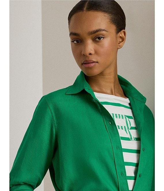 From Lauren Ralph Lauren Petite, this shirt features: Woven fabrication Point collar Long roll-tab sleeves with buttoned barrel cuffs Pleating at the cuffs Relaxed fit Intended to hit at the hip Buttoned placket with "Lauren Ralph Lauren"-engraved buttons Shirttail hem Button-front closure Approx. 27.5" body length and a 31.5" sleeve length Body length and sleeve length are taken from the center back of the neck Sleeve length changes 1" between sizes. closure Linen Machine washable or dry clean Imported.