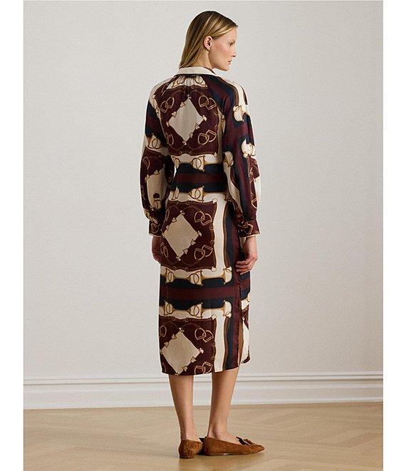 From Lauren Ralph Lauren, this dress features: Smooth luxe twill fabrication Point collar Long blouson sleeves with buttoned band cuffs Equestrian-inspired print Unlined. Straight fit Belt not included Raglan seams Shirring into the neckline Intended to hit at the mid-calf Metal buttons custom-developed with an "LRL" logo at the collar and cuffs Side on-seam pockets Side-split hem Button-front closure Approx. 48.5" length, 32.75" sleeve length Dress length and sleeve length are taken from the center back of the neck Polyester Machine wash cold/tumble dry low Imported.