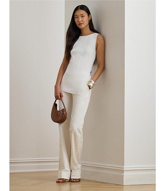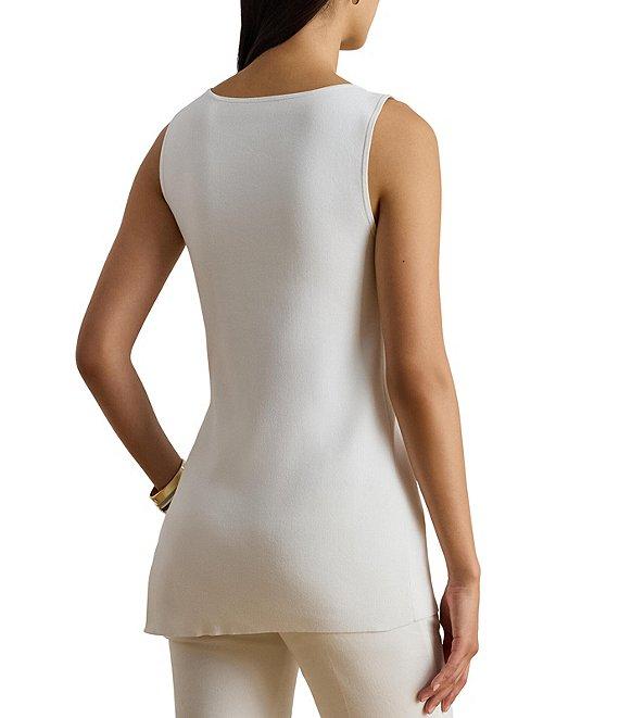 From Lauren Ralph Lauren, this sweater top features: Rib-knit fabrication Boat neckline Sleeveless Slim fit Left-side-seam slit creates an asymmetric hem Pullover construction Approx. 25" length Viscose/nylon Hand wash or dry clean Imported.