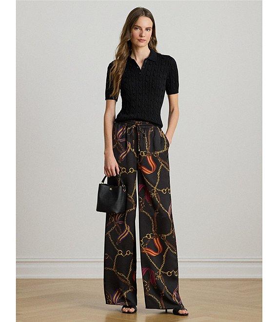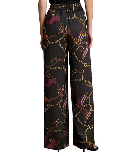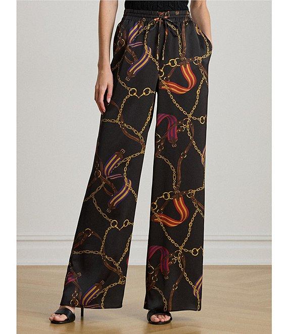 From Lauren Ralph Lauren, these pants feature: Satin fabrication Belting print pattern Two front waist angled pockets Wide leg silhouette Ankle length Elasticized waist Draw cord closure Brass cord ends with LRL logo Approx. 31.5" inseam, 26" leg opening, 11.25" rise Recycled polyester Hand wash cold/line dry or dry clean Imported.
