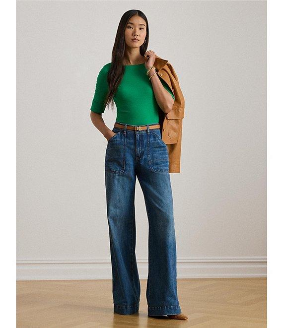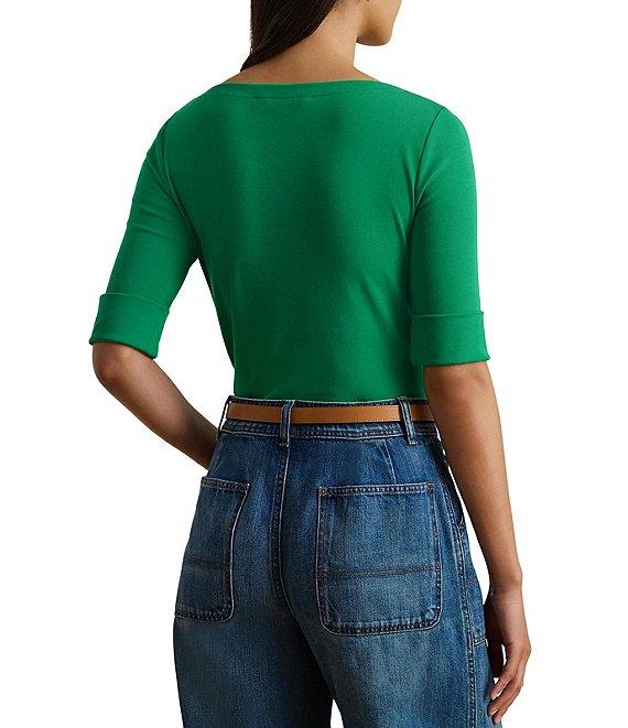 From Lauren Ralph Lauren, this tee features: Stretch cotton knit fabrication Tee silhouette Boat neckline Elbow length sleeves with folded cuffs Slim fit “LRL” monogram at the hem for a signature Lauren style Side split hemline Pullover construction Approx. 25" length Cotton/elastane Machine washable or dry clean Imported.