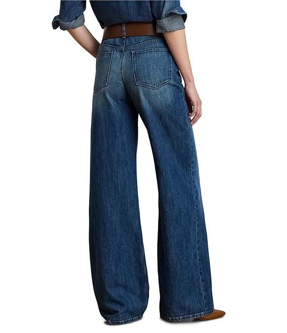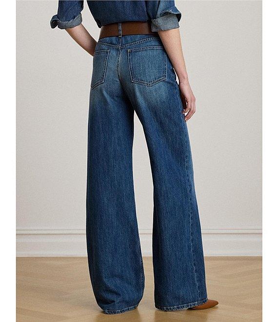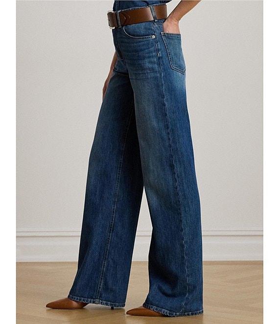 From Lauren Ralph Lauren, these jeans feature: Stretch denim fabrication Wide leg silhouette High rise 5 pocket styling Belt lops Relaxed fit Sliming interior panels Full length Front button and zipper closure Approx. 32" inseam,24.75 Leg opening, 12.25" rise Cotton/lyocell Machine wash Imported.