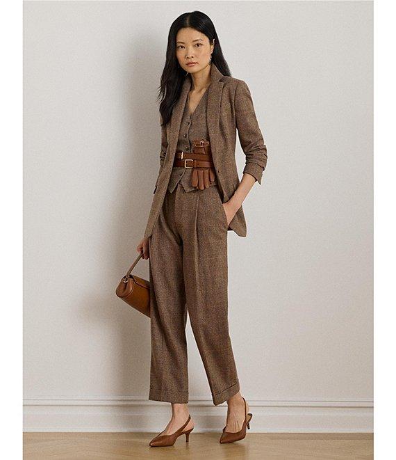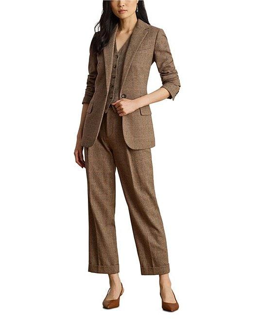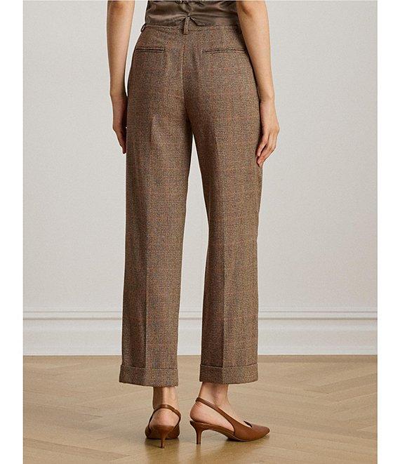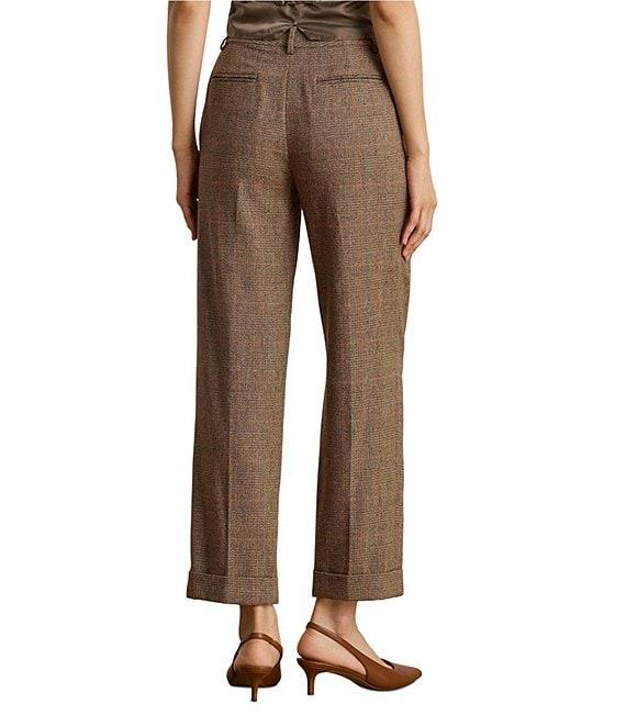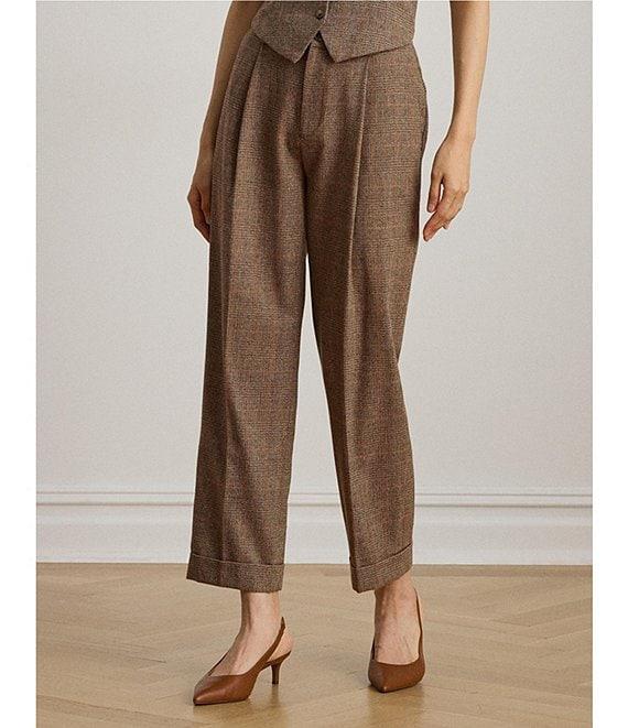 From Lauren Ralph Lauren, these pants feature: Glen plaid pattern Wide leg silhouette Two front angled and two back waist besom functional pockets Pleat details Creases run down from front and back of legs Folded cuffed hemline Cropped length Front button and zipper closure Approx. 26.5" inseam, 18" leg opening, 13.75 rise Cotton/wool/polyester Machine wash Imported.