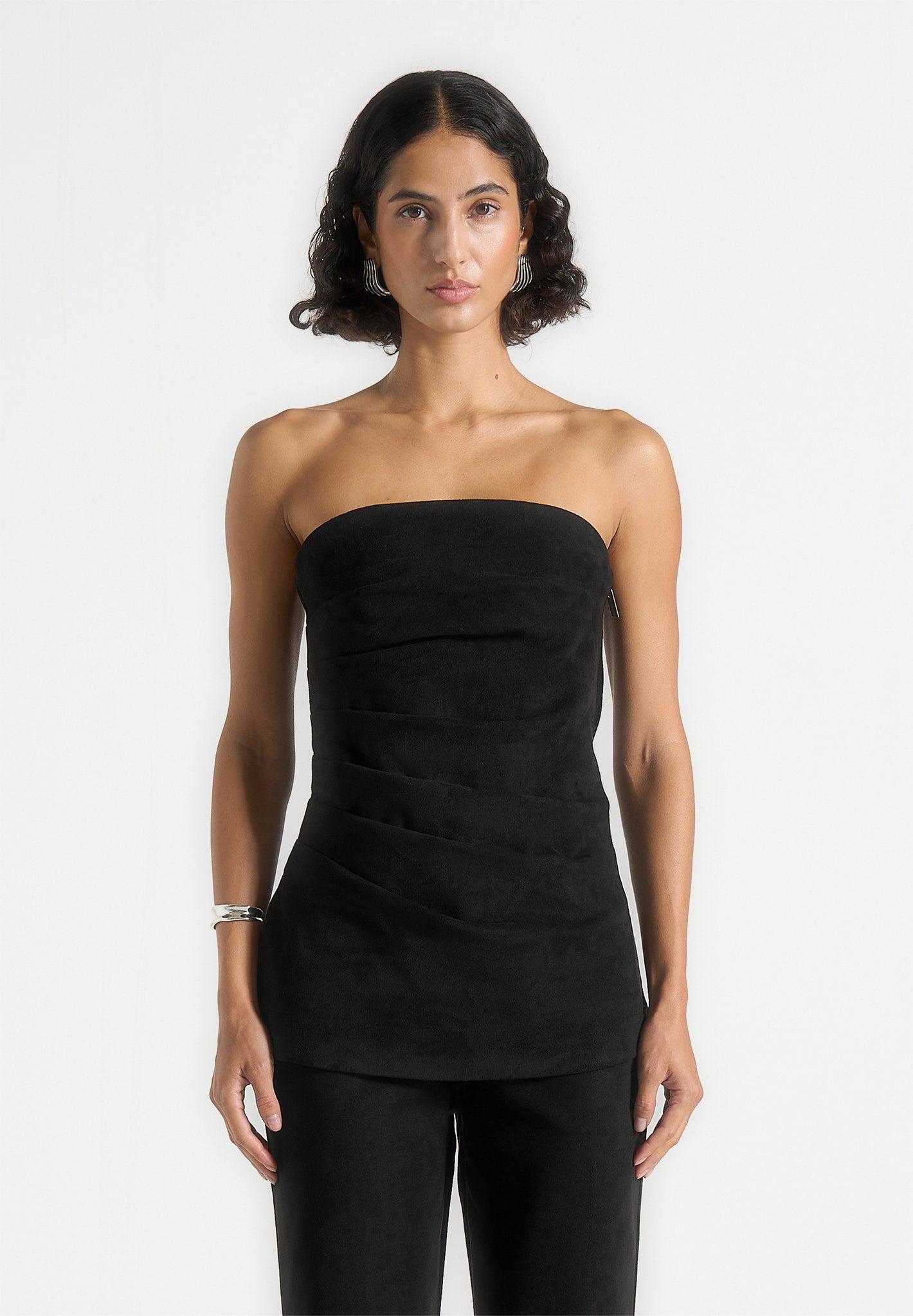 This bandeau top reimagines a classic shape with a sleek longline silhouette for a modern, refined look. Crafted from soft suede fabric for a premium feel, it features tacked detailing for subtle structure and dimension. A polished silver side zip completes the design, adding an elevated finish. Bandeau design with a longline silhouette for a sleek, modern look Tacked detailing adds subtle structure and dimension Crafted from soft suede fabric for a premium feel Silver side zip for a polished, elevated finish Silver Manière De Voir Eiffel to centre back