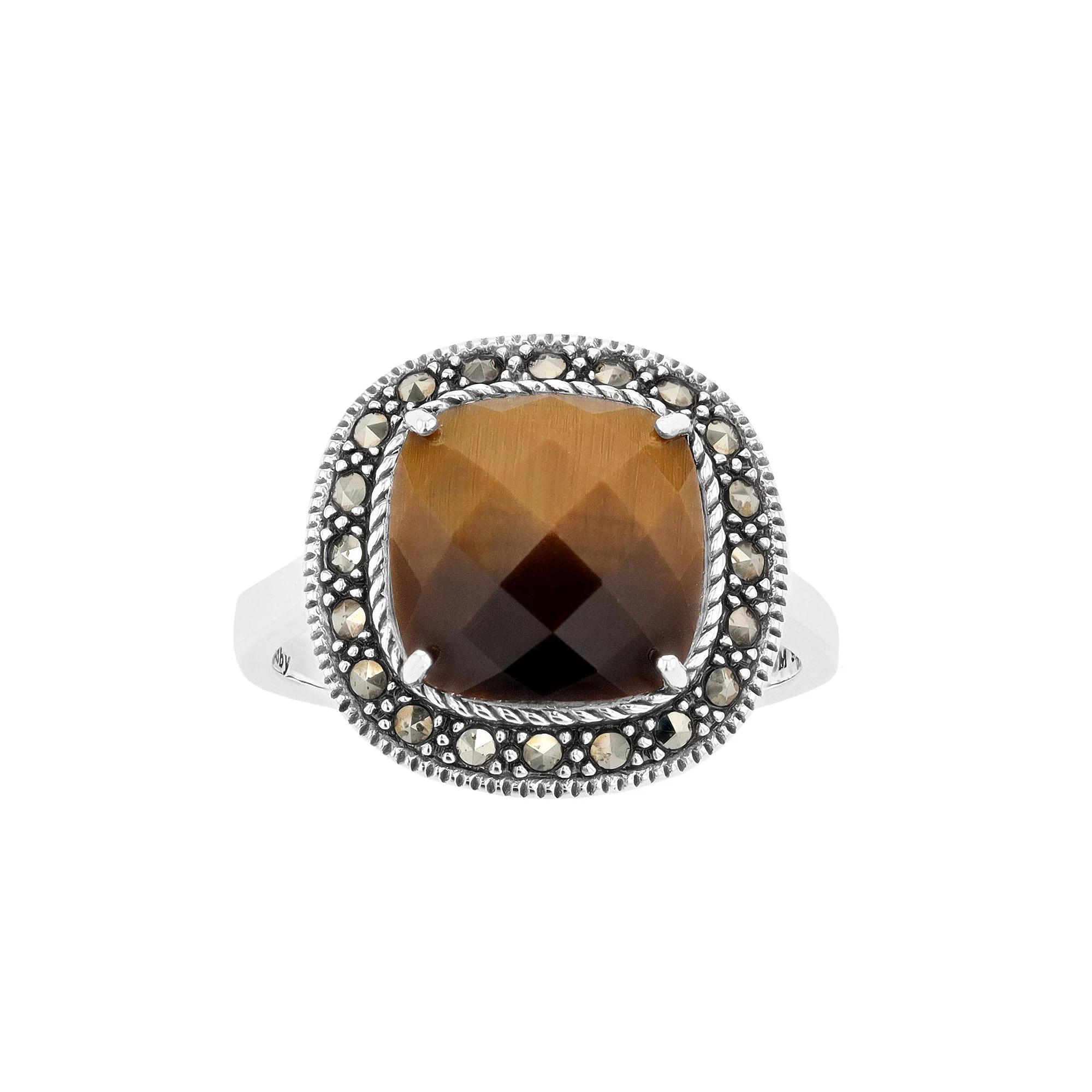 Designed with a cushion-shaped tiger's-eye gemstone and marcasite accents, this Lavish by TJM sterling silver ring offers eye-catching style. Designed with a cushion-shaped tiger's-eye gemstone and marcasite accents, this Lavish by TJM sterling silver ring offers eye-catching style. Metal: sterling silver Packaging: boxed Width: 0.79 in. Finish: oxidizedSTONE DETAILS Stone type: tiger's eye, marcasite Total weight: 3 1/2 ct. Center stone weight: 3 3/8 ct. Center stone size: 10 mm x 10 mm Shape: cushion cut Setting: prong Gemstones may have been treated to enhance their appearance. Special care may be required. Please visit our Gemstone Treatment & Special Care Guide for more information. Please note, due to the high value of this item, a signature may be required upon delivery. Size: 6. Gender: female. Age Group: adult.