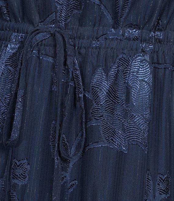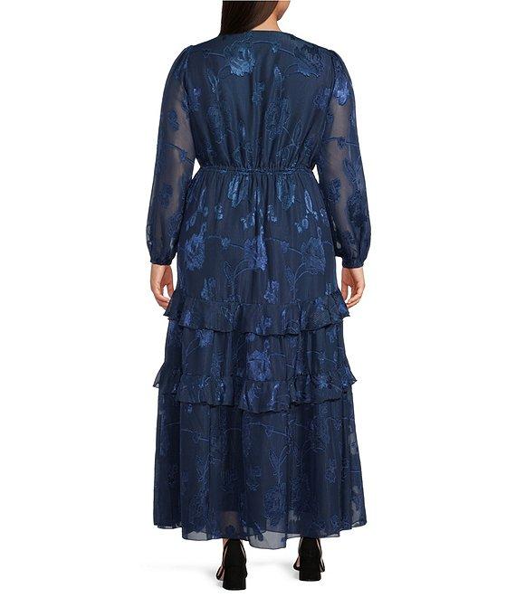 From Layered With Love Plus, this dress features: Jacquard chiffon fabric A-line V-neckline Long sleeves Elastic waist with tie Tiered hem Maxi Pullover construction Lined Approx. 52.5" length Polyester; Lining: poly/spandex Dry clean preferred or handwash with like colors, lay flat to dry. Imported.