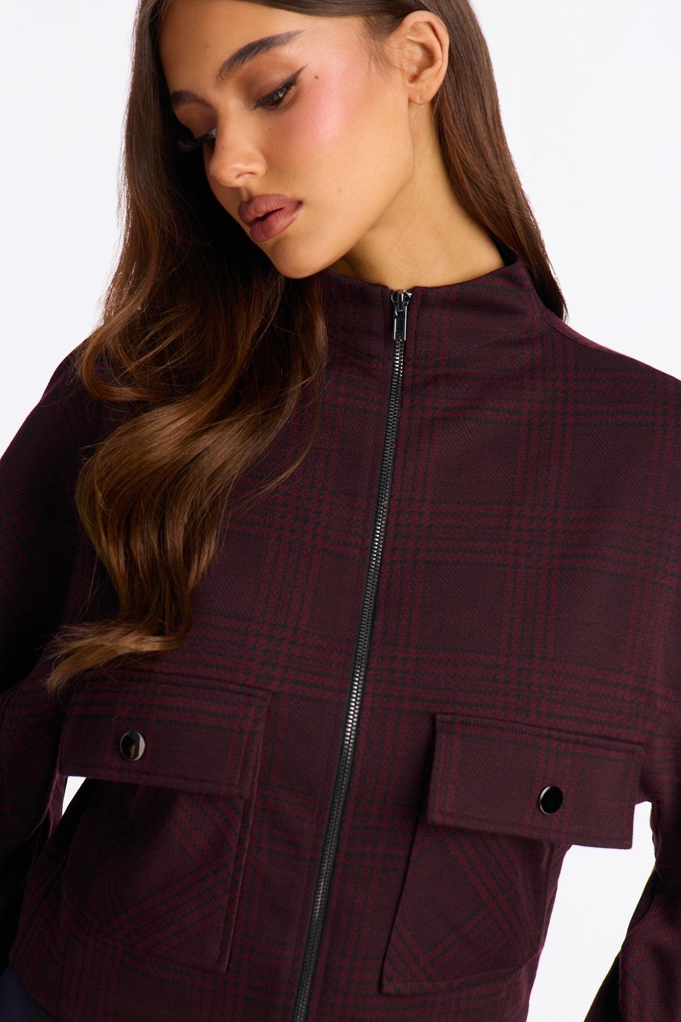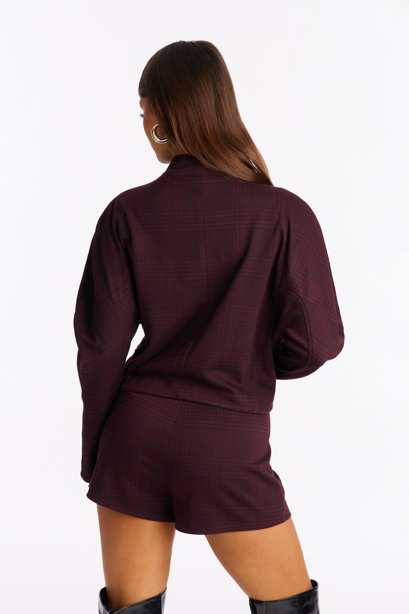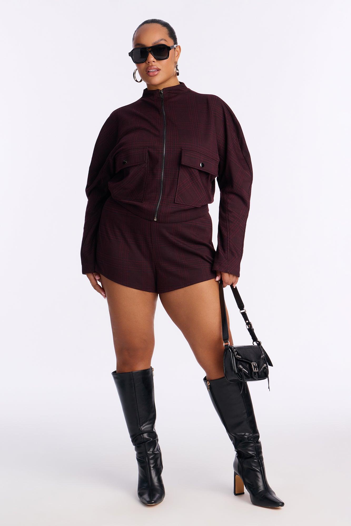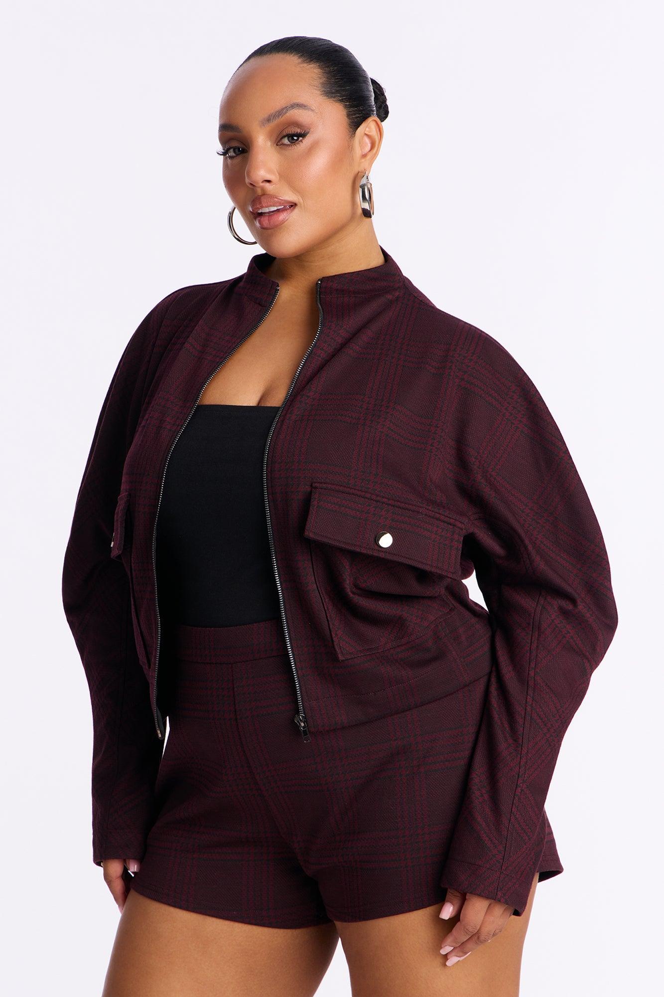 Available In Taupe/combo And Wine. 2 Piece Ensemble Zip Up Jacket And Short Set Stretch Pockets Invisible Side Zipper On Shorts Disclaimer: Plaid Placement Will Vary. Top & Bottom Self: 85% Polyester 10% Nylon 5% Spandex Top Lining: 100% Polyester Imported