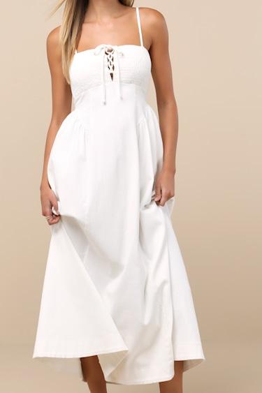 This cotton denim midi was made to be your go-to sundress, featuring a breezy silhouette that'll be perfect for sweltering summer days. Adjustable straps support a stretchy smocked bodice with a lace-up detail at the front and empire-style waist, all atop an A-line skirt with gathered panels and pockets at the sides. Cutout along the waist at back.