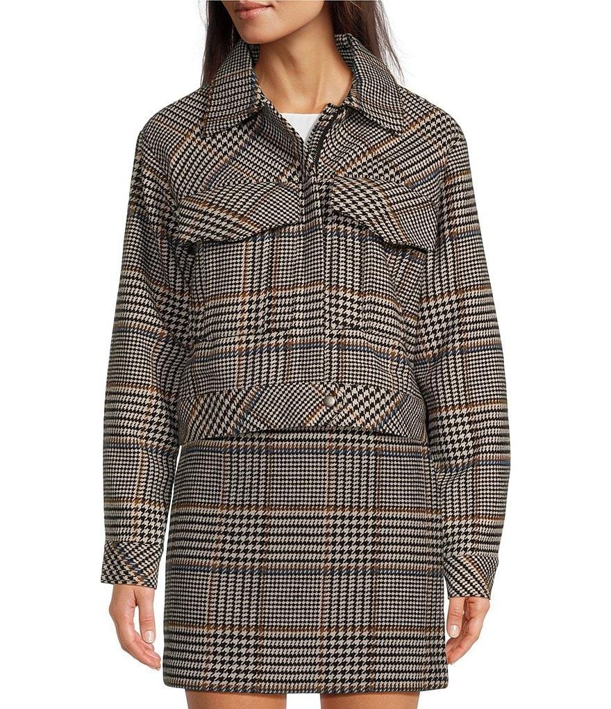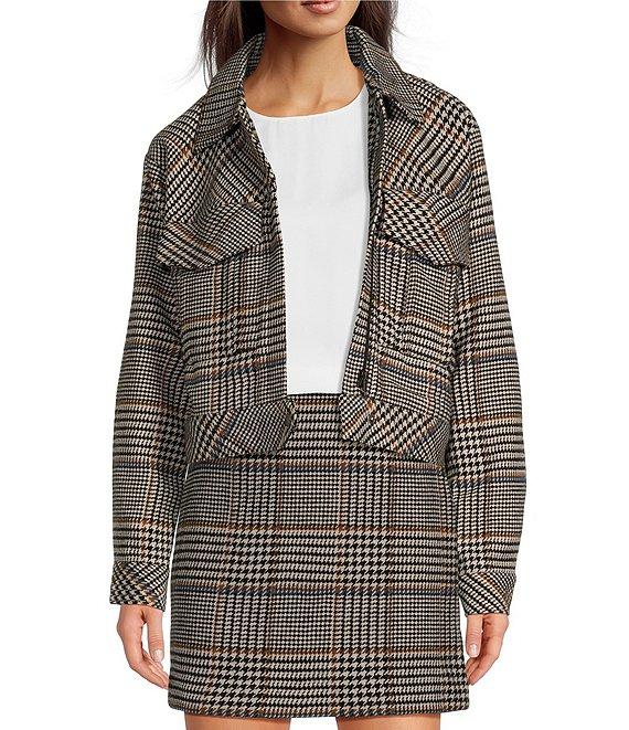 From Le' AL.X, this jacket features: Wool Blend Knit Fabrication Bomber Jacket Silhouette Point Collar Long Sleeves Dropped Shoulders Glen Plaid with Houndstooth Detail Snap Button Cuffs Functional Front Oversized Double Flap Pocket Fixed Lining Cropped Length Straight Hemline Hidden Front Zipper with Bottom Snap Closure Approx. 21" in Length Wool, Acrylic, Polyester,Nylon Professional Dry Cleaning Imported.