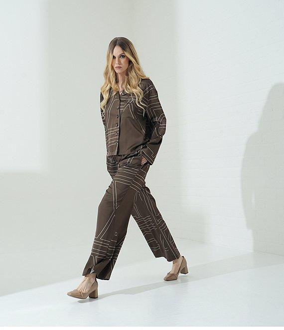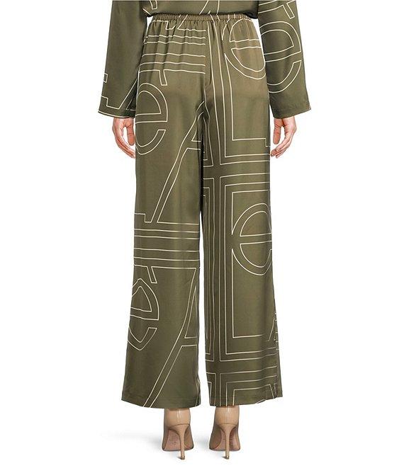From Le' AL.X, these pants features: Mod Le' AL.X logo print Satin fabrication High rise waistline Internal elastic waistband Pull-on construction Lounge pant silhouette Relaxed fit Flounce hemline Full length Approx. 29" inseam Polyester Hand wash in cold water, promptly remove from wash, hang on line to dry, use low steam iron if needed. Imported. Dillard's Exclusive