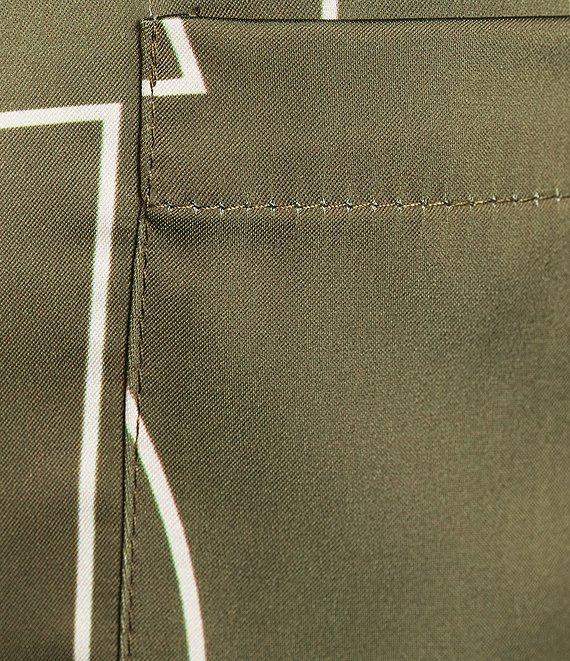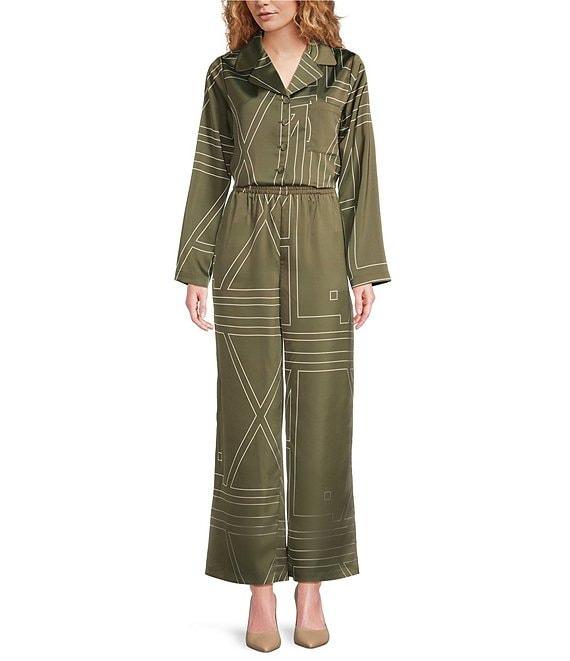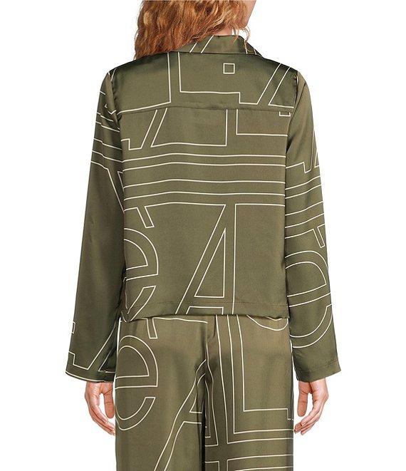 From Le' AL.X, this shirt features: Mod Le' AL.X logo print Satin fabrication Notch lapel collar V-neckline Slightly dropped shoulder Long sleeves Self covered button front Front patch pocket Button front shirt silhouette Relaxed fit Straight hemline Cropped length Approx. 22.75" HPS in length Polyester Hand wash in cold water, promptly remove from wash, hang on line to dry, use low steam iron if needed. Imported. Dillard's Exclusive